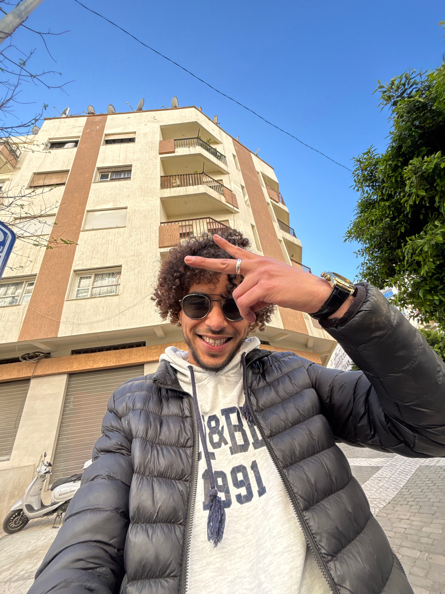 A man with curly hair and sunglasses is holding up two fingers in a peace sign. He is wearing a black puffy jacket over a gray hoodie. A building is visible behind him, and trees and blue sky are in t…read more