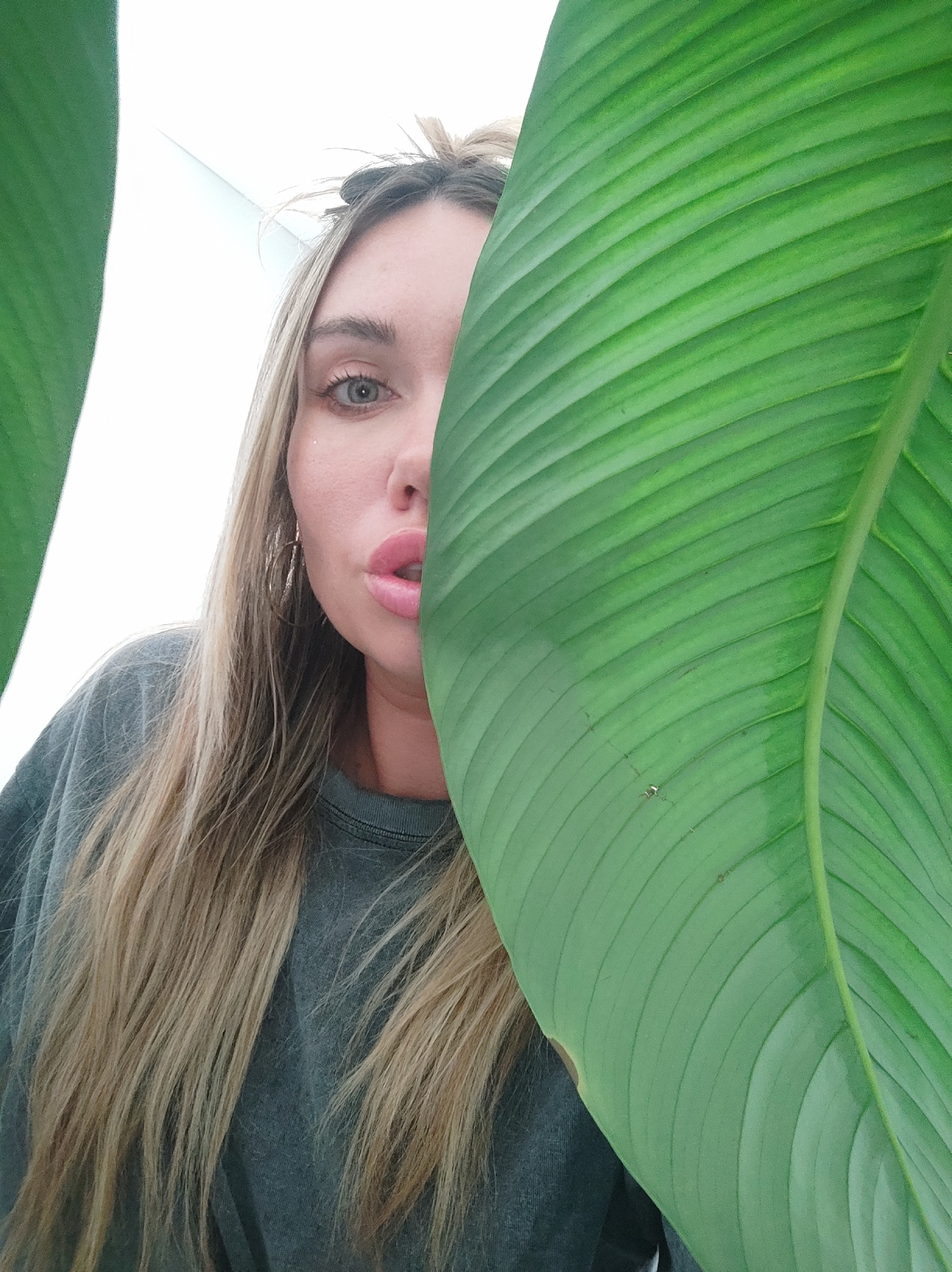 The image depicts a close-up, angled portrait of a woman partially obscured by large green leaves. The woman, with long blonde hair and light-colored eyes, gazes directly at the viewer. Her face is po…read more