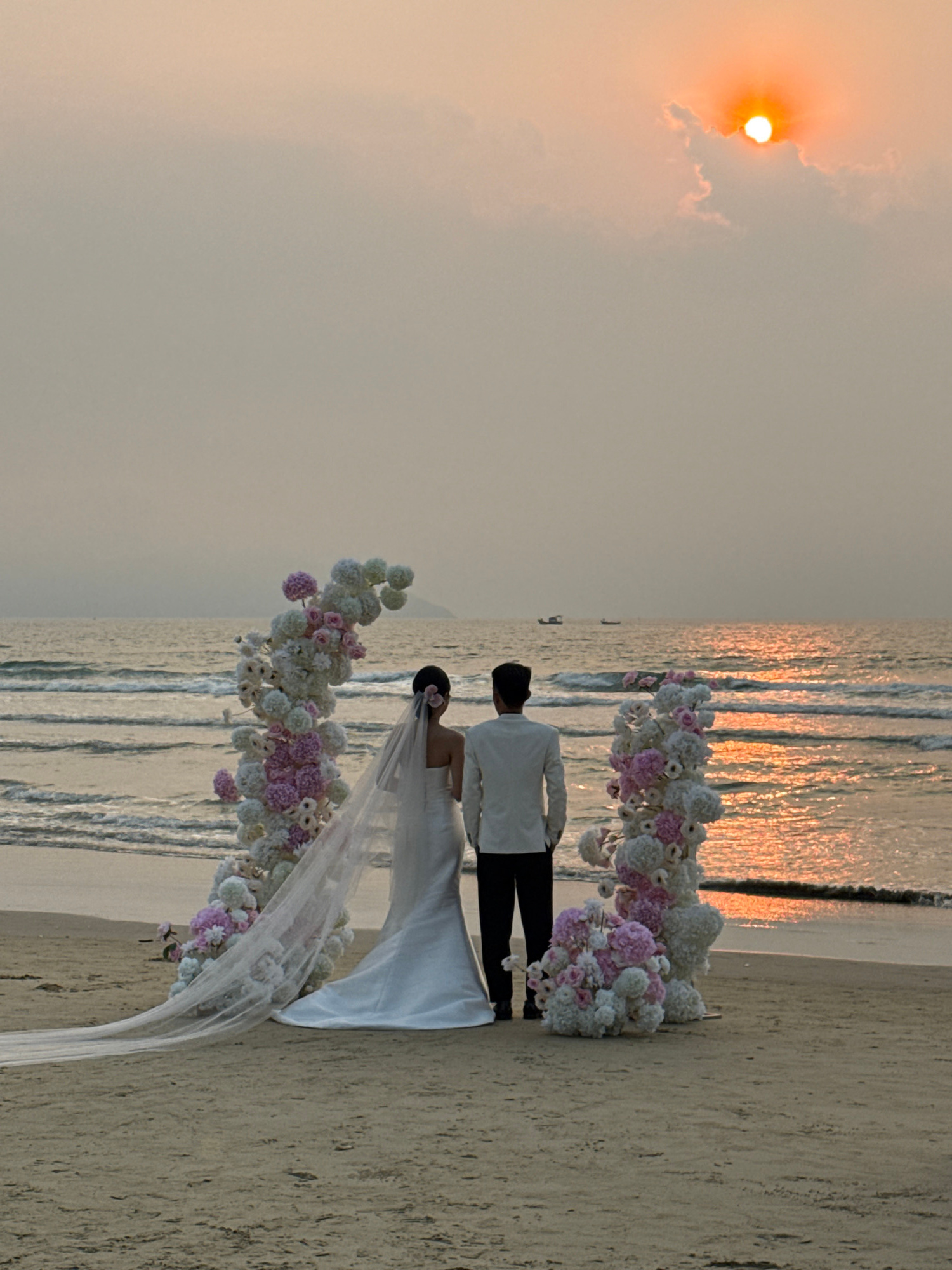 A wedding ceremony on a beach at sunset. A bride in a white dress and veil stands next to a groom in a white shirt and dark pants. They are positioned in front of a floral arch of white and pink flowe…read more