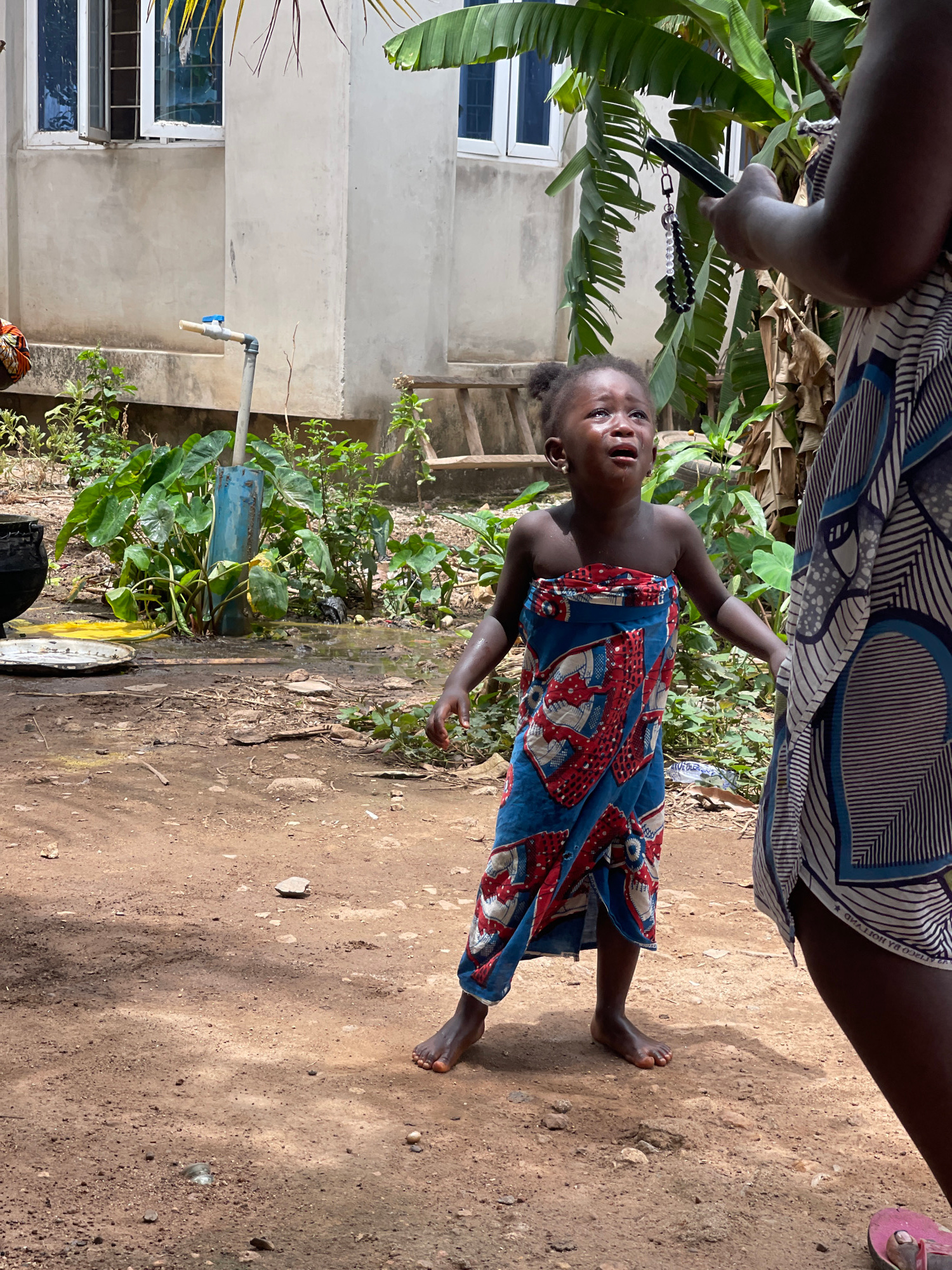 A young child wearing a colorful dress stands on a dirt surface near a building and a water pipe in an outdoor location. A person is holding a phone with a beaded strap. The surrounding environment in…read more