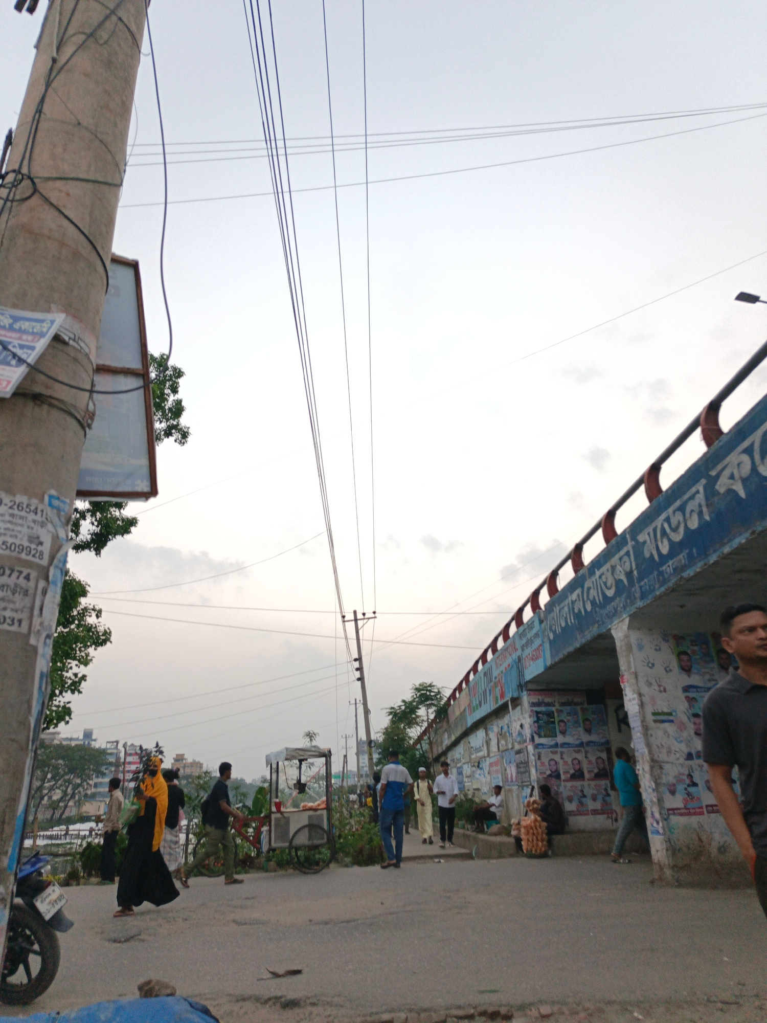 The image depicts a street scene in Dhaka, Bangladesh. A power pole with signage is on the left. Overhead, several power lines stretch across the sky. A bridge with graffiti and signage spans the stre…read more