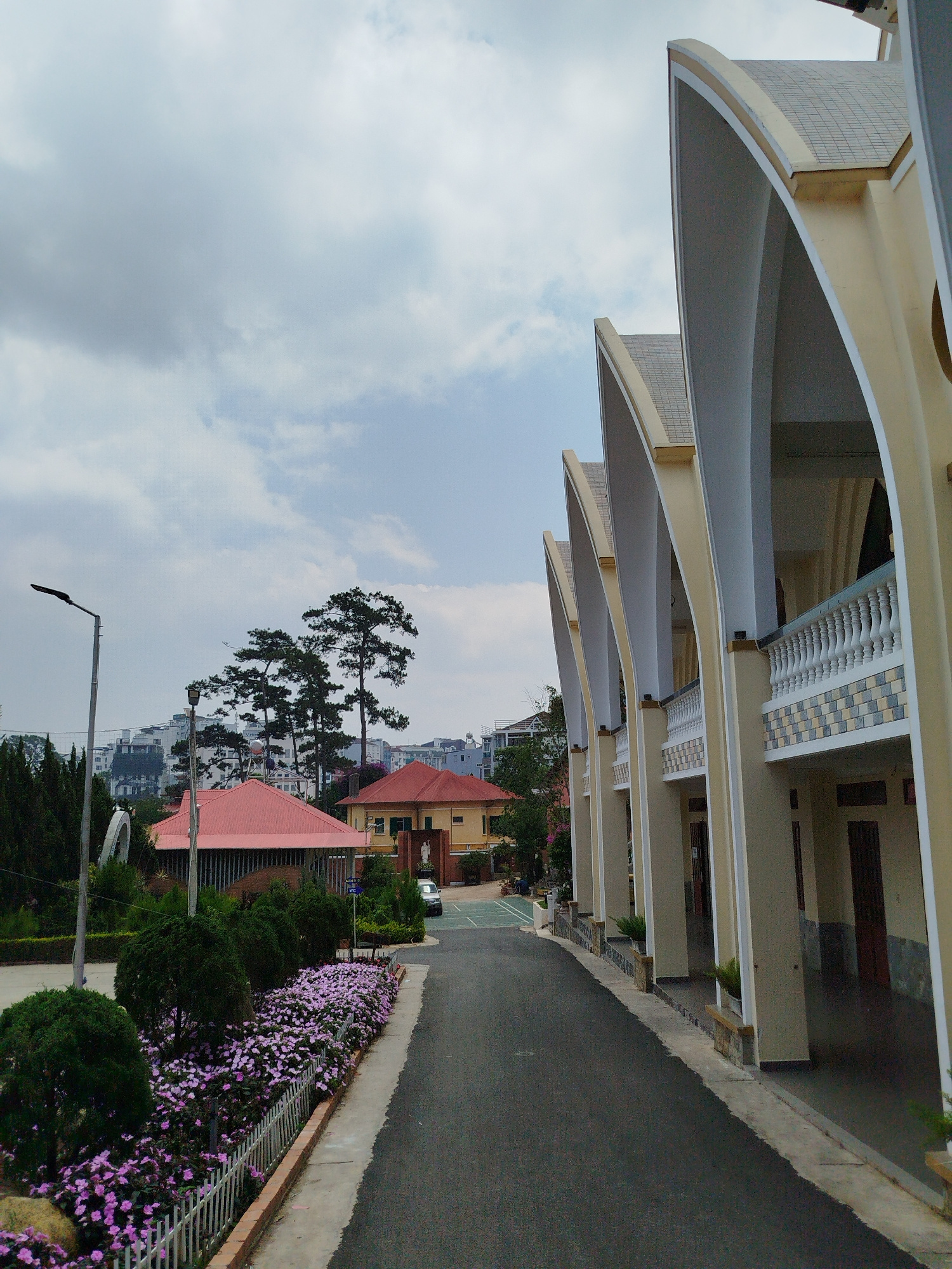 The image depicts a street in Da Lat, Vietnam. On the right side is a building with a series of arched supports, a tiled roof, and balconies. The street extends into the distance, lined with a flowerβ¦read more