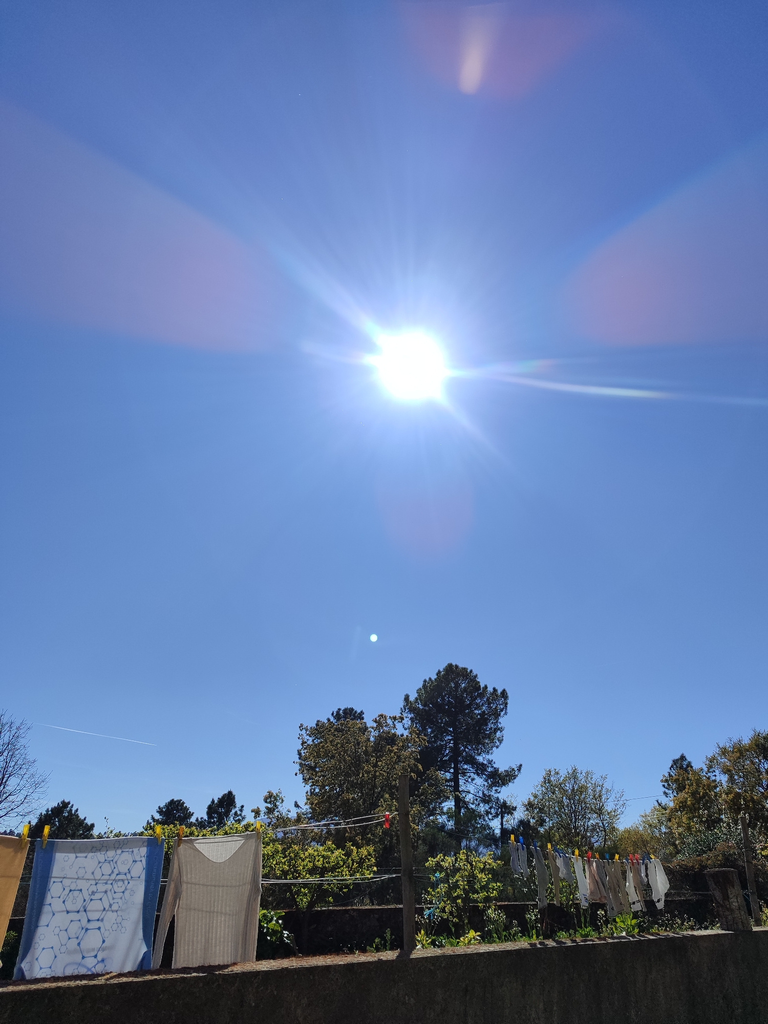 The image depicts a bright, sunny day in Vila Real, Portugal. A clothesline is strung across the foreground, holding various articles of laundry. Behind the clothesline, there's a low stone wall, thenβ¦read more