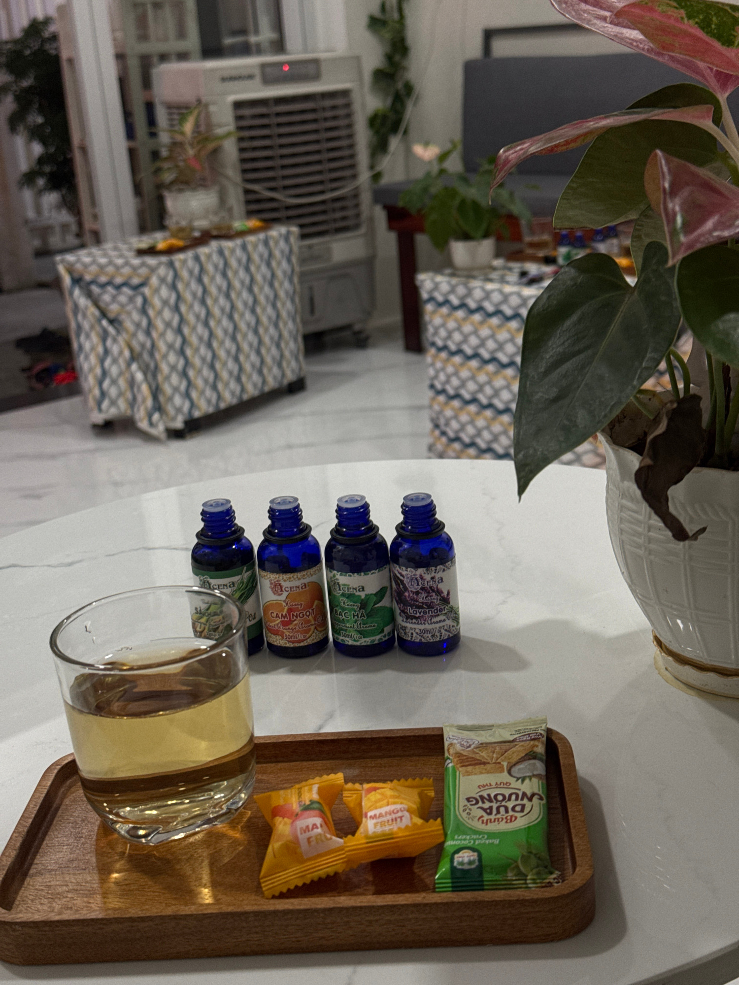 Here is a matter-of-fact description of the image: The image shows a still life arrangement on a white surface, likely a table. The objects are arranged near an Anthurium plant in a white pot. There…read more