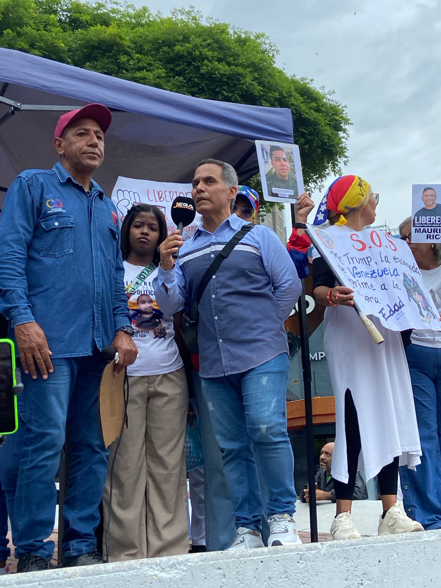 This image captures an outdoor political protest or rally in Caracas, Venezuela, under an overcast sky. Several individuals are present, advocating for various causes. In the foreground, a man in a bl…read more