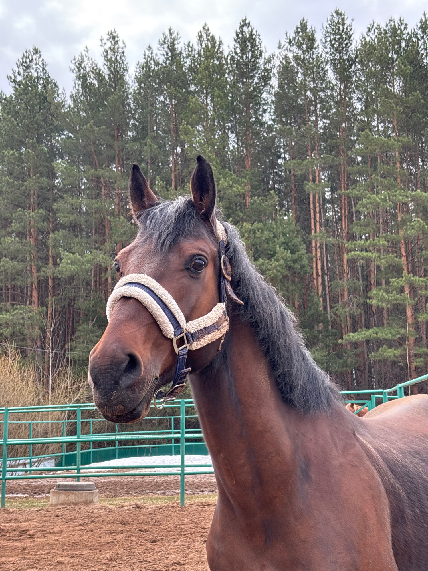 A horse stands in Русский Вожой, Russia. The horse is brown with a black mane and a white and blue halter. The horse is standing next to a green metal fence. The background is a forest of tall pine tr…read more
