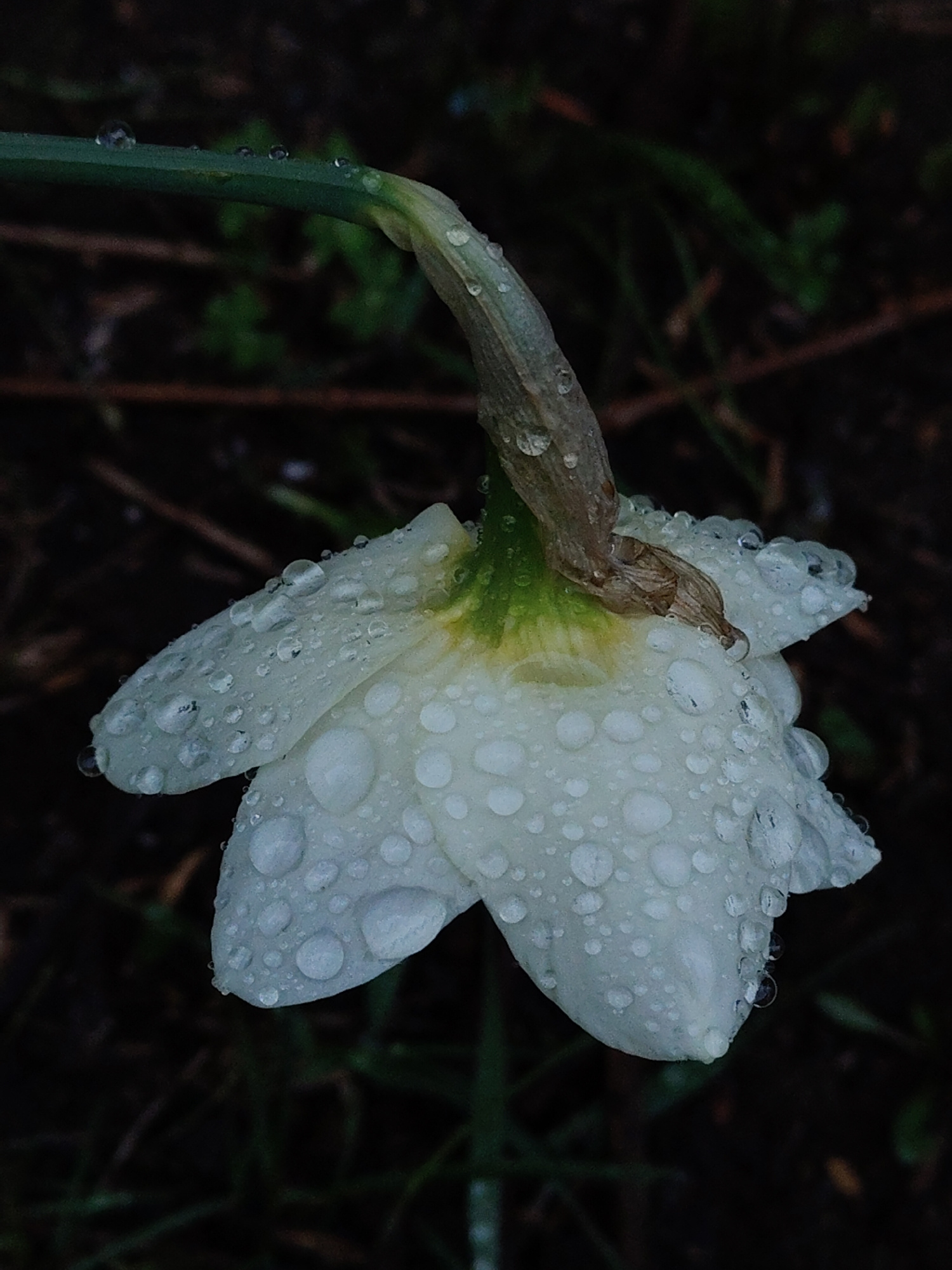 A close-up, medium shot captures a white flower, likely a daffodil, heavily adorned with water droplets. The flower hangs downwards, its stem curving back towards the top of the frame. The background…read more