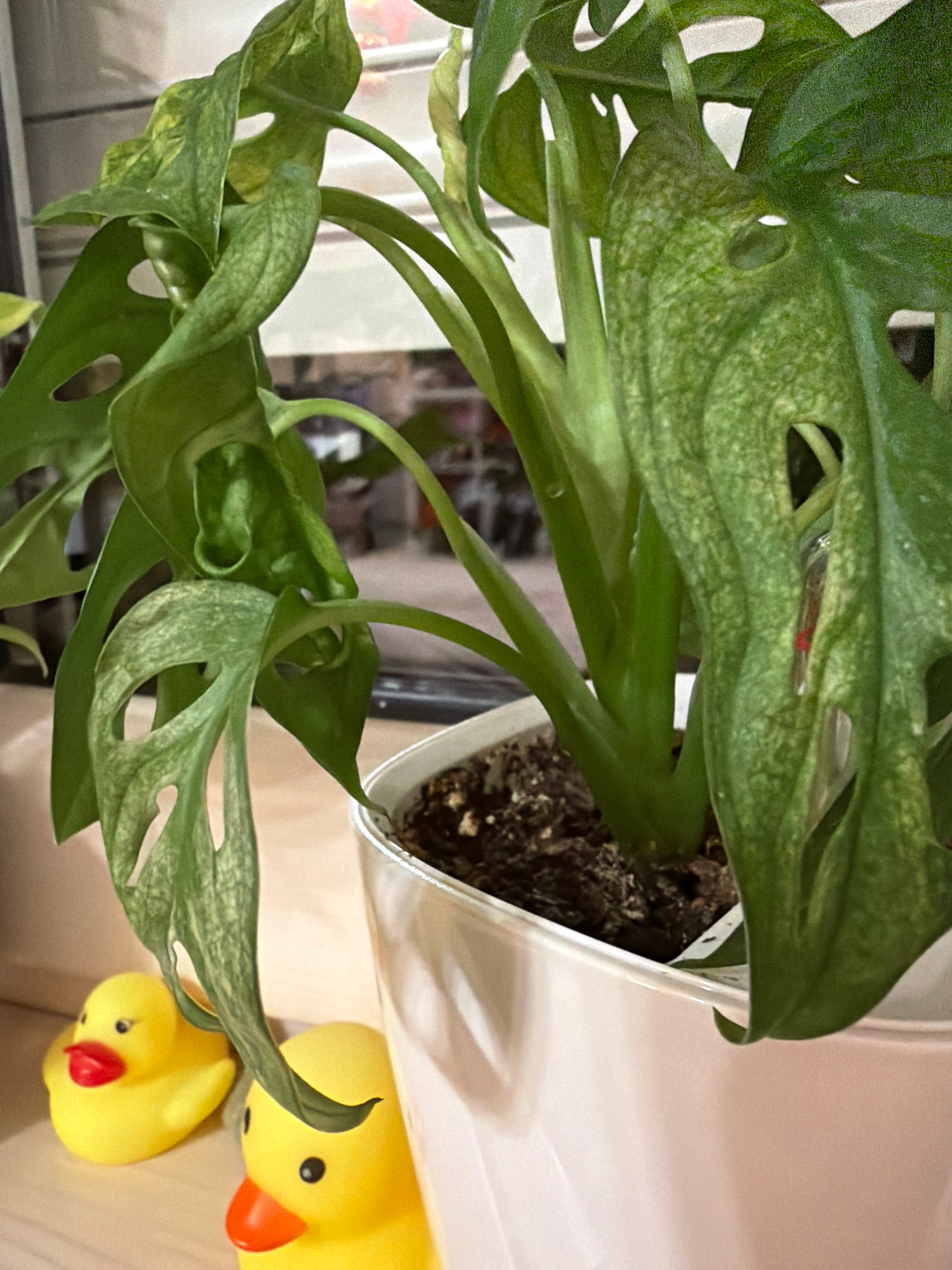 A close-up shot displays a plant with distinctive fenestrated leaves, likely a Monstera adansonii, potted in a white container with visible soil. Adjacent to the plant are two yellow rubber ducks with…read more