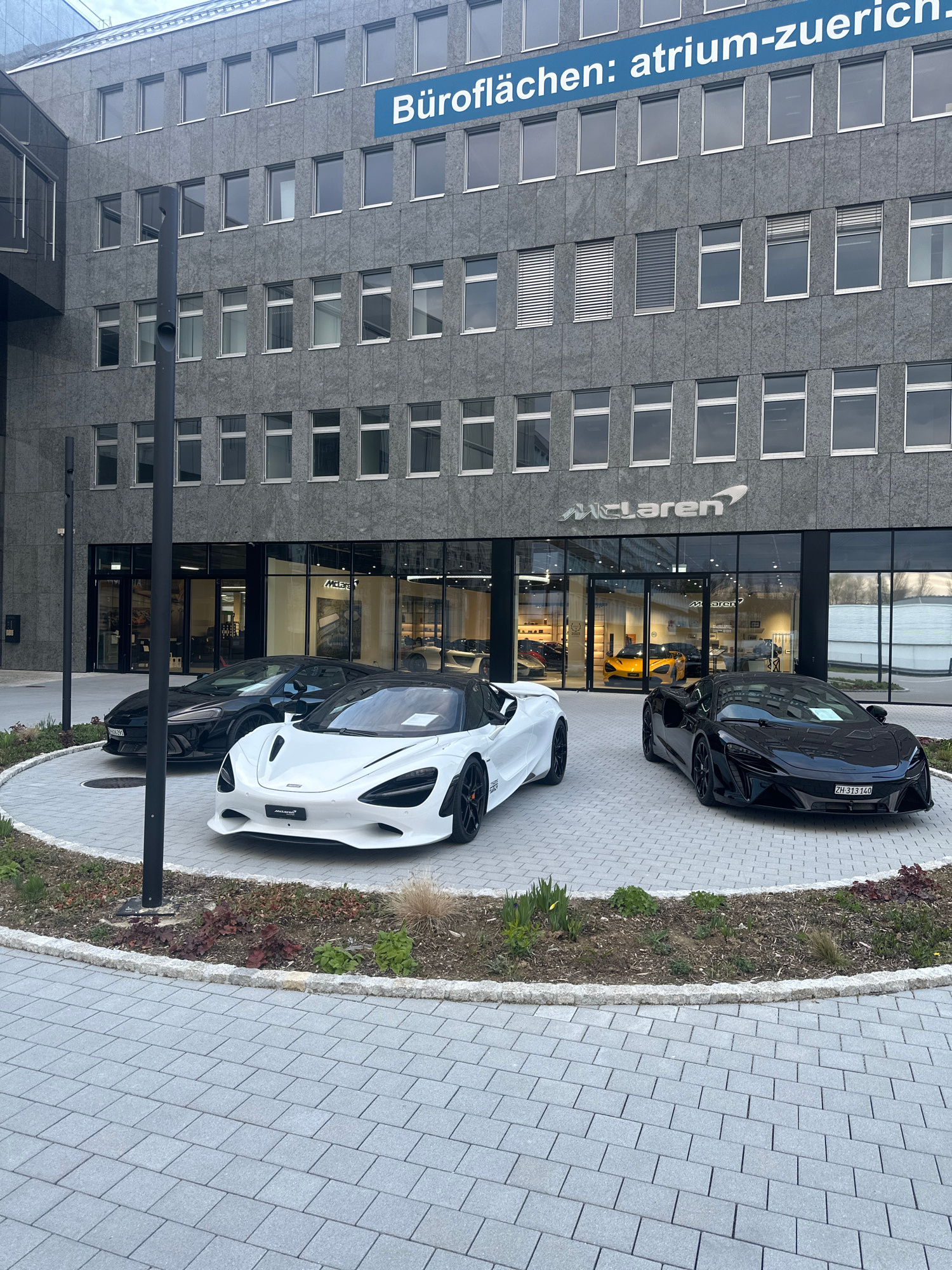 The image depicts the exterior of a McLaren dealership located in Glattbrugg, Switzerland. Two McLaren sports cars, one black and one white, are parked in front of the building's entrance. The dealers…read more