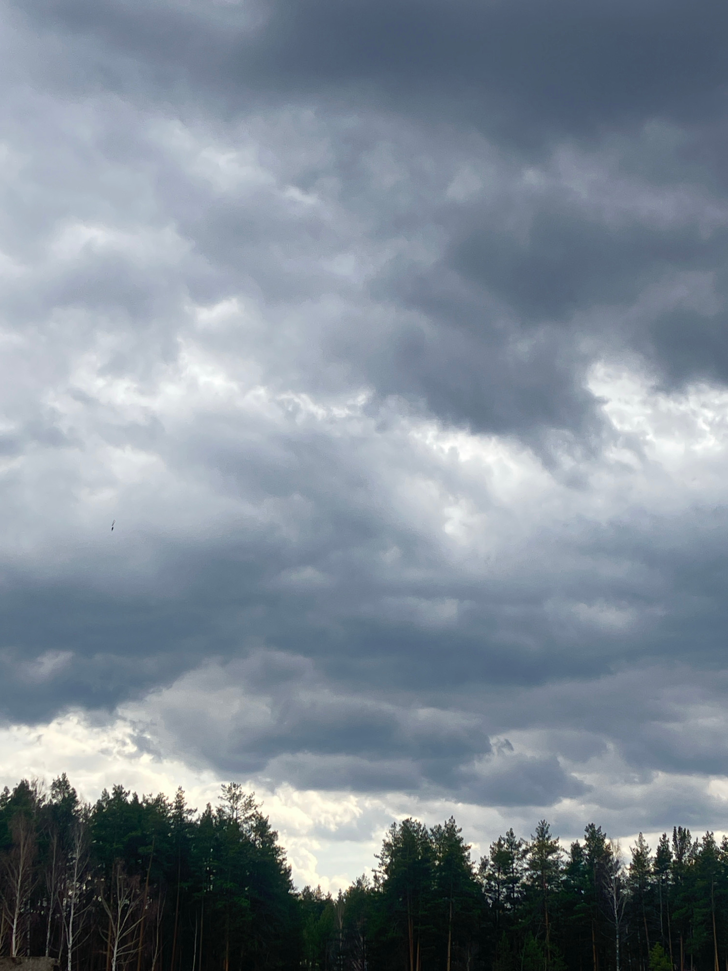 The image displays a vast, dramatic sky dominated by heavy, dark grey clouds, suggesting overcast conditions or impending weather. Streaks and patches of brighter white clouds are interspersed through…read more