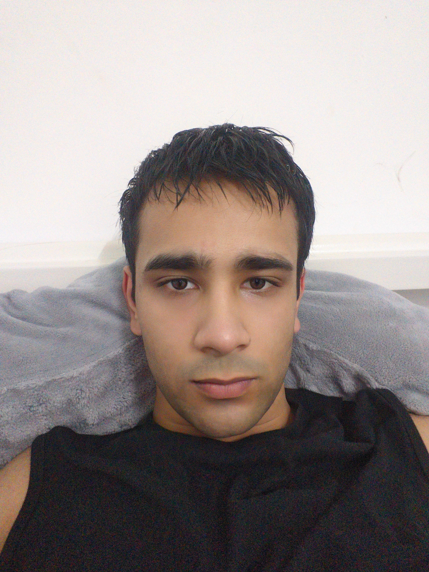 A close-up, slightly grainy, eye-level photograph shows a young man with dark hair and brown eyes. He is lying down against a grey pillow. He is wearing a black sleeveless shirt. The background is a p…read more