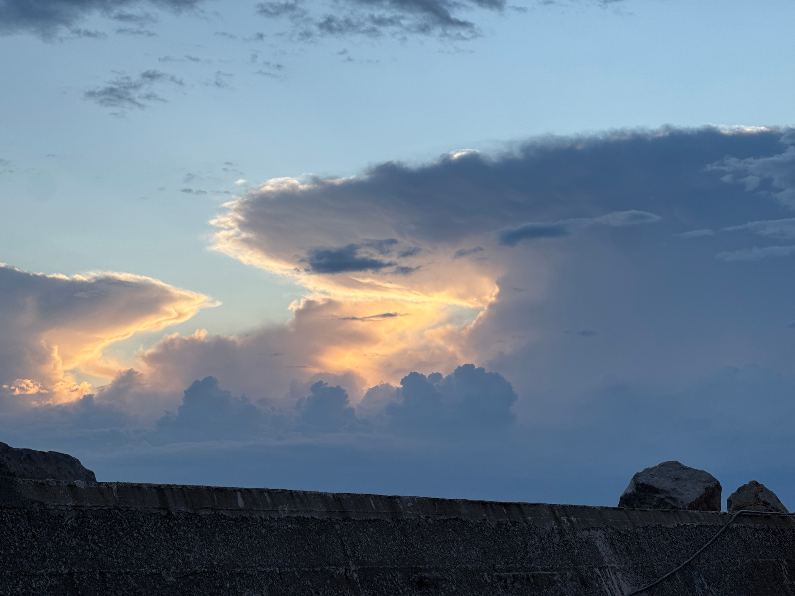 A low-angle photograph depicts a section of a gray concrete wall or embankment against a backdrop of a clouded sky at dusk or dawn in Νέα Καλλικράτεια, Greece. Two prominent gray rocks are positioned…read more