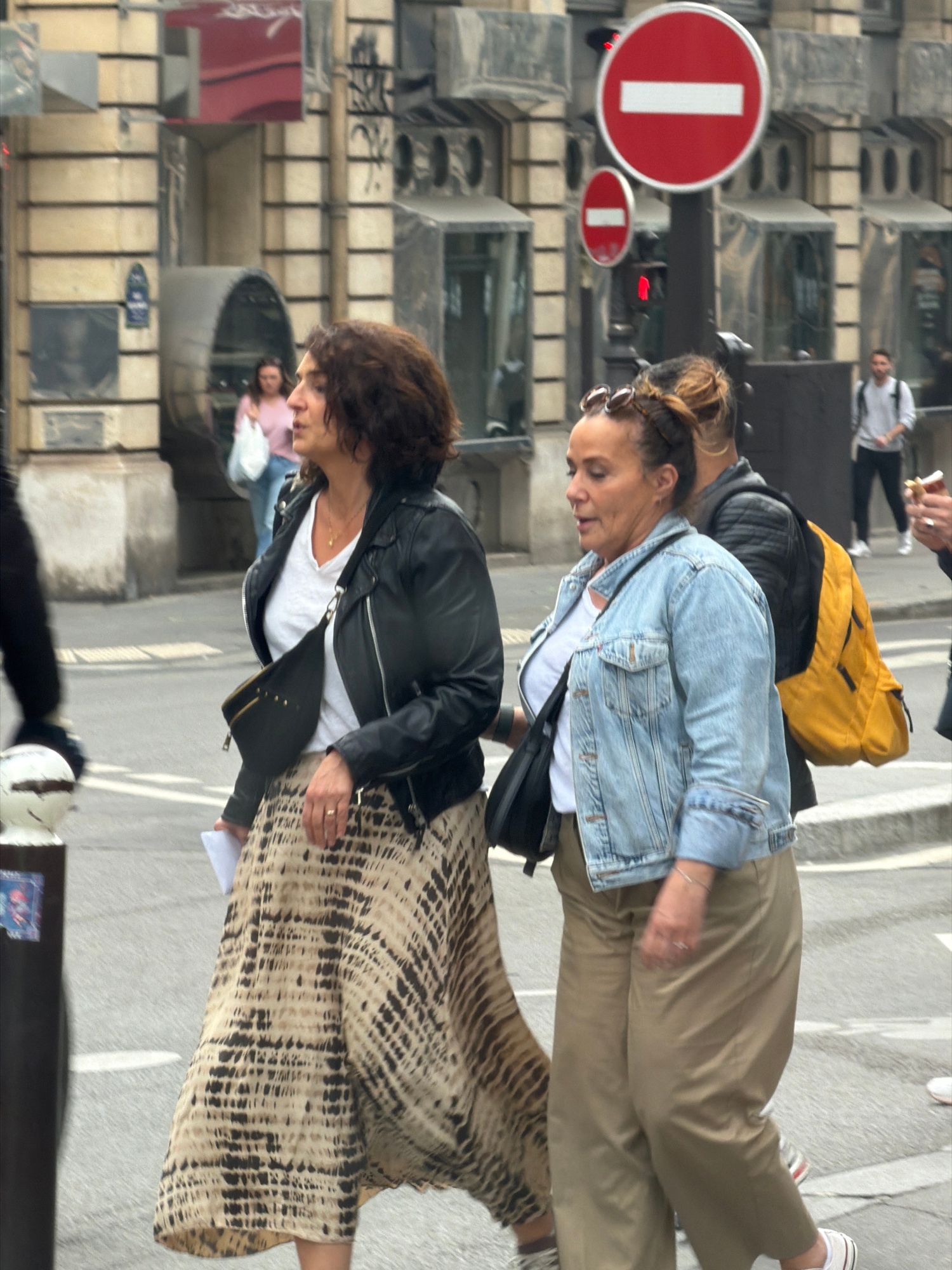 The image shows two women walking on a sidewalk in Paris, France. The woman in the foreground has short, curly dark hair and is wearing a black leather jacket over a white t-shirt, paired with a long…read more