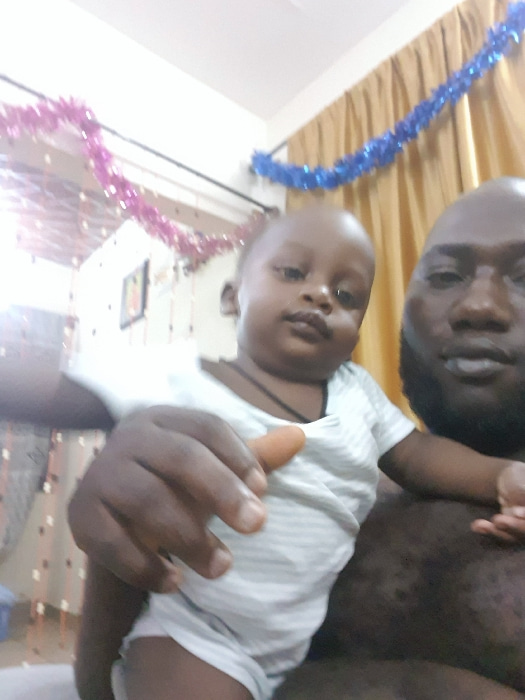 Indeterminate indoor location in the city of Unknown, Unknown. The image depicts an adult male holding an infant. The adult, with dark skin and a beard, is positioned on the right, displaying his bare…read more