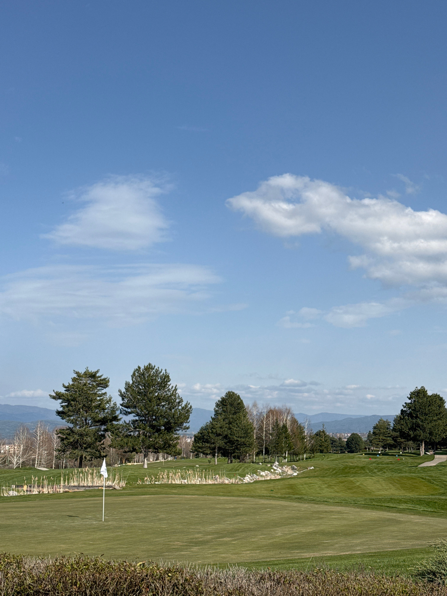 The image depicts a golf course in Razlog, Bulgaria, under a partially cloudy blue sky. Green grass covers the course, bordered by trees and hedges. A white flag marks the hole. In the background, mou…read more