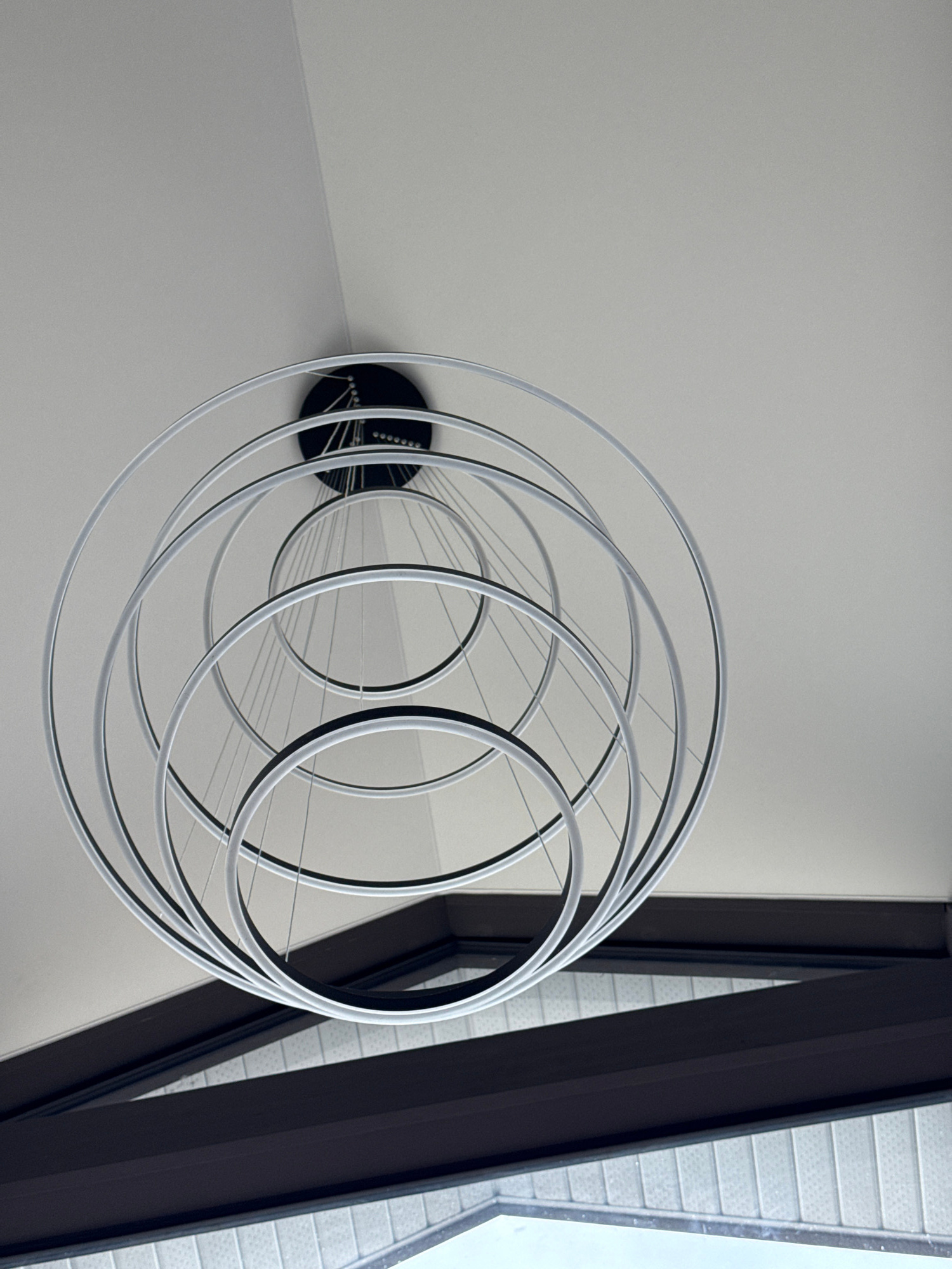 The image displays a modern, multi-ringed chandelier suspended from a light-colored ceiling. The chandelier consists of several concentric and overlapping rings of varying diameters, appearing to be m…read more