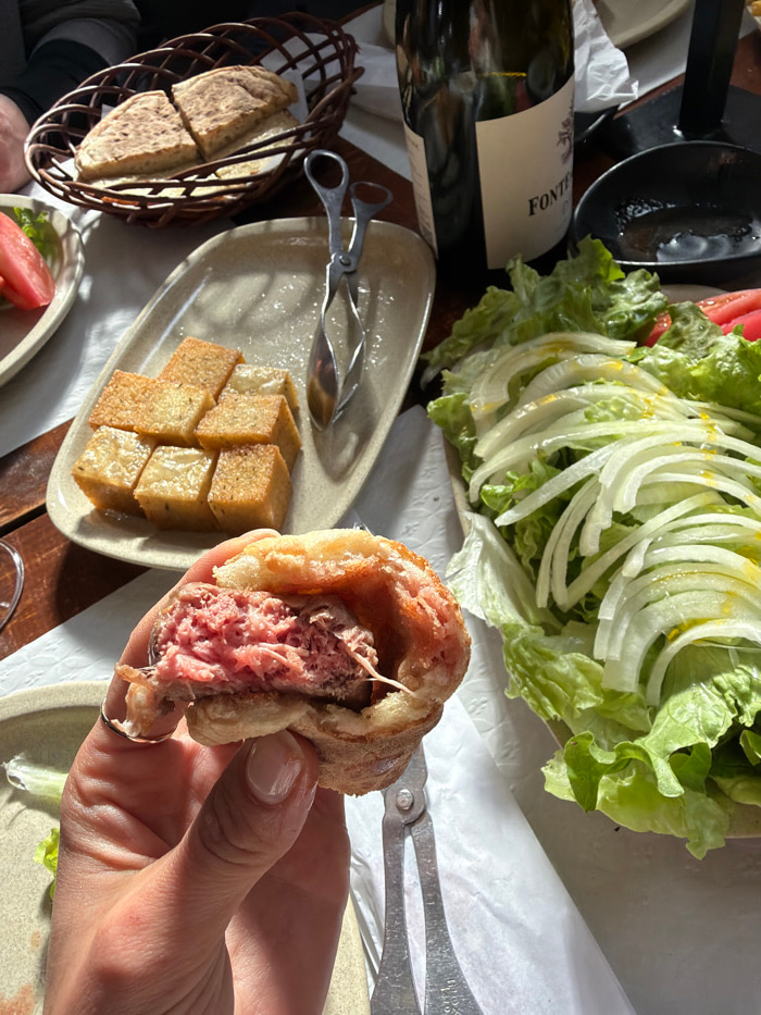 A hand holds a partially eaten sandwich, revealing meat filling. Lettuce, sliced onions, and a bottle of wine are visible in the background. A plate holds cubed food items next to a pair of tongs. Mor…read more