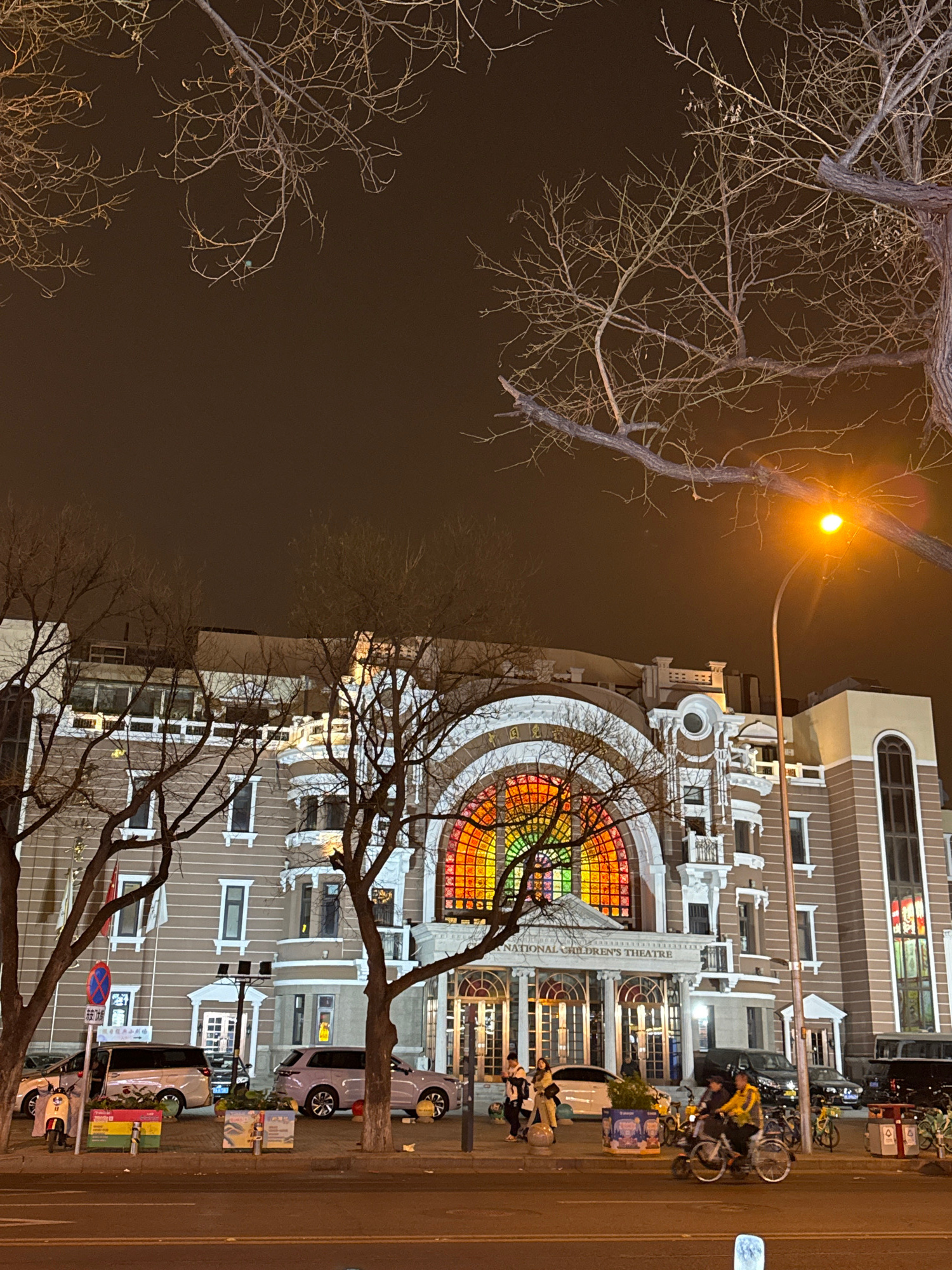 The image depicts the National Children's Theatre in Dongcheng District, China, at night. The building has a large, colorful arched window above the entrance. People and bicycles are present on the si…read more