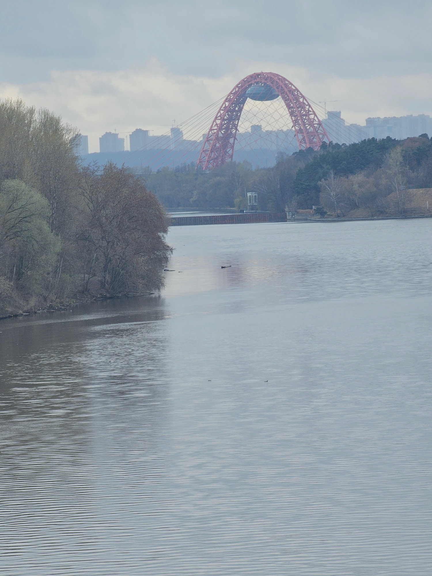The image shows a view of the Zhivopisny Bridge in Khimki, Russia, spanning a body of water. The bridge is a distinctive red cable-stayed structure with a large arch. Buildings are visible in the back…read more