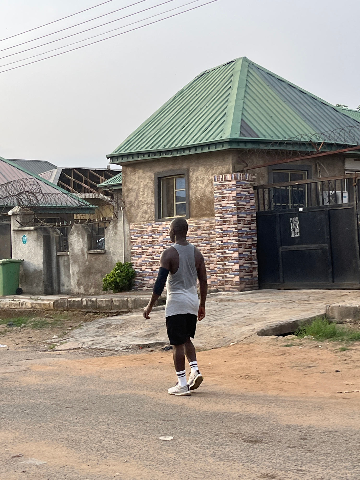 The image depicts a man walking on a paved street in Abuja, Nigeria. He is wearing a white tank top, black shorts, white sneakers, and white socks with black stripes. He appears to be alone. To his le…read more