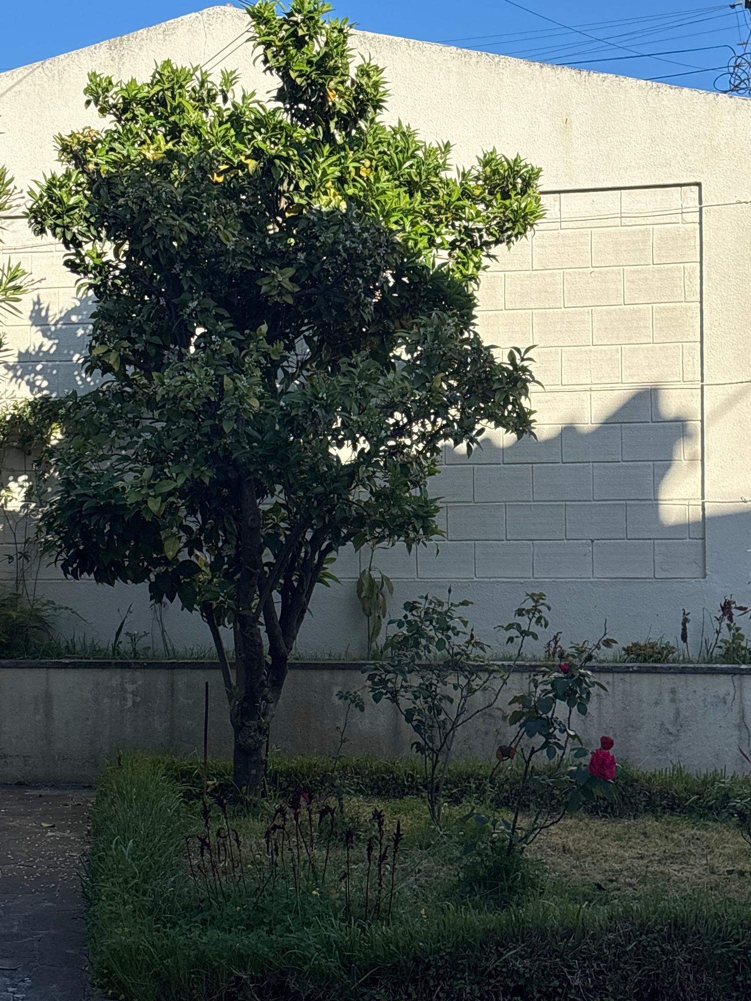 The image shows a building corner in Lisbon, Portugal, with an orange tree in the foreground, its branches extending towards the viewer. The building wall behind the tree is white, with a rectangular…read more