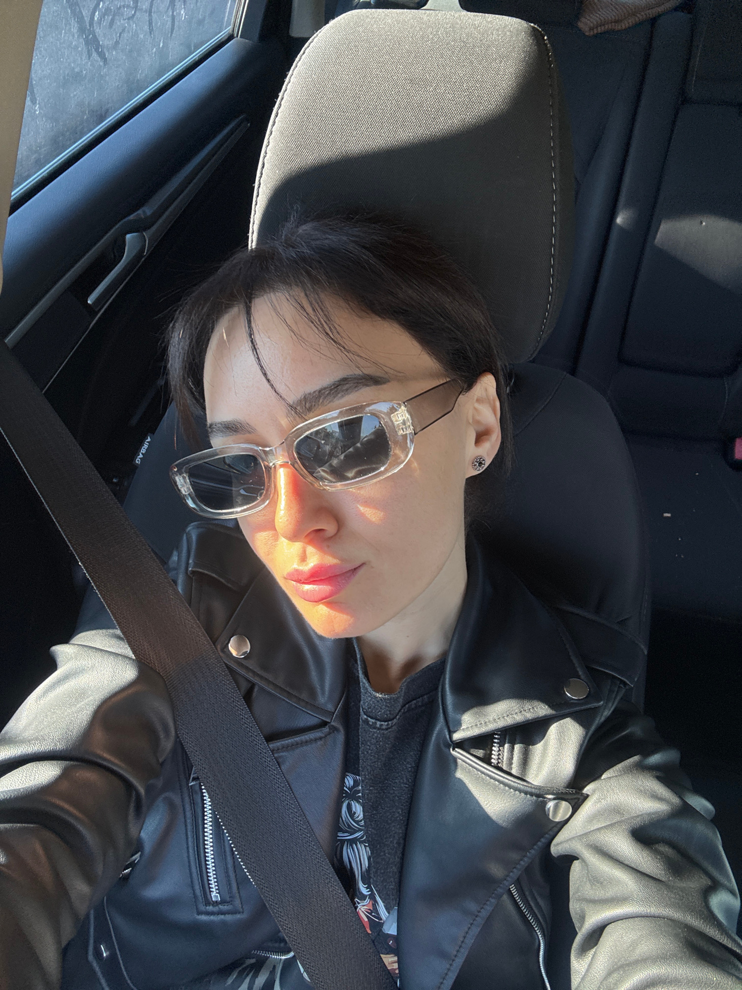 A person is reclining in a car seat, wearing a black leather jacket and clear-framed sunglasses. They are wearing a seatbelt. The interior of the car is primarily black. The location cannot be determi…read more