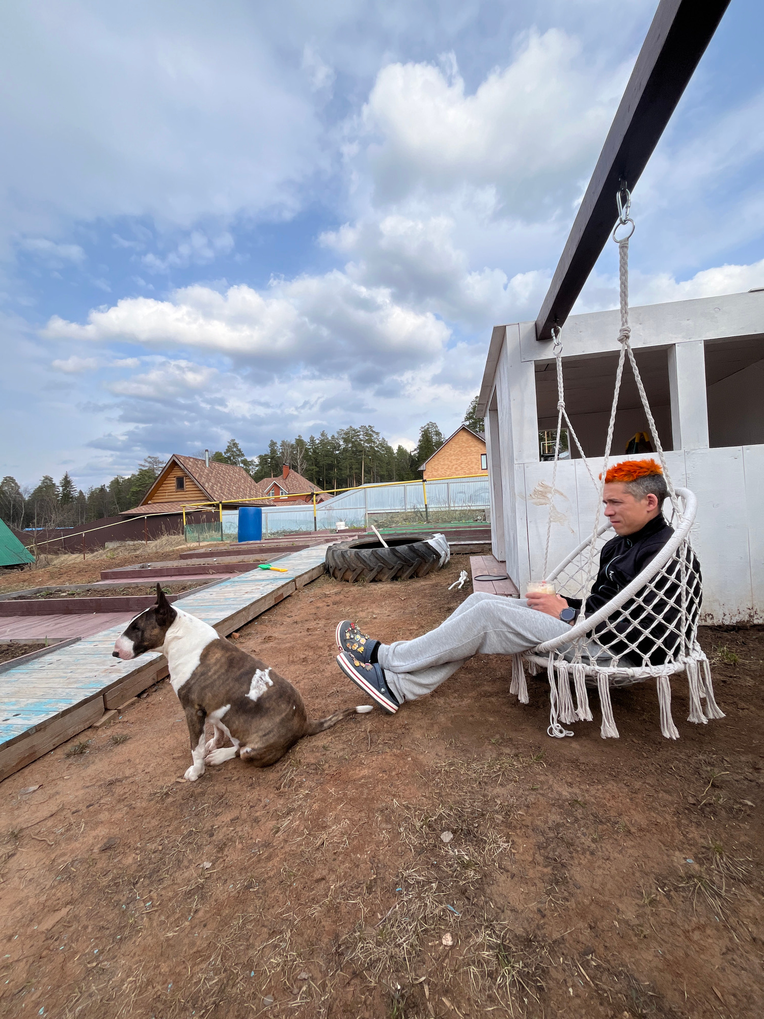 A medium-shot depicts a person sitting in a rope-net swing with a dog lying on the ground. The individual, seen from the side, has bright orange hair and is wearing a black jacket, grey sweatpants, an…read more