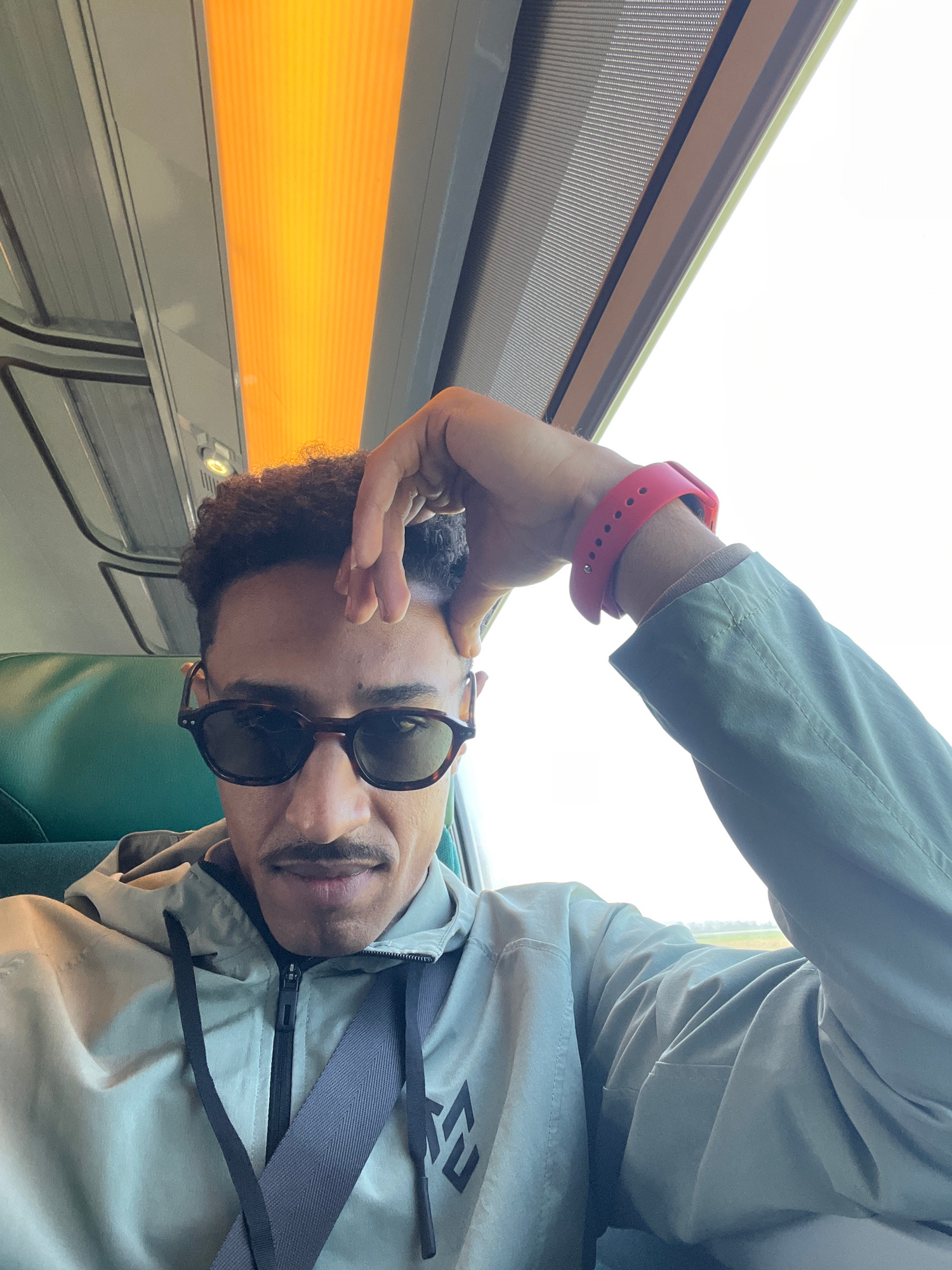 The image displays a male individual seated inside a modern passenger train car. The subject, a man with dark, curly hair and a mustache, wears dark, round-framed sunglasses. He is dressed in a lightβ¦read more
