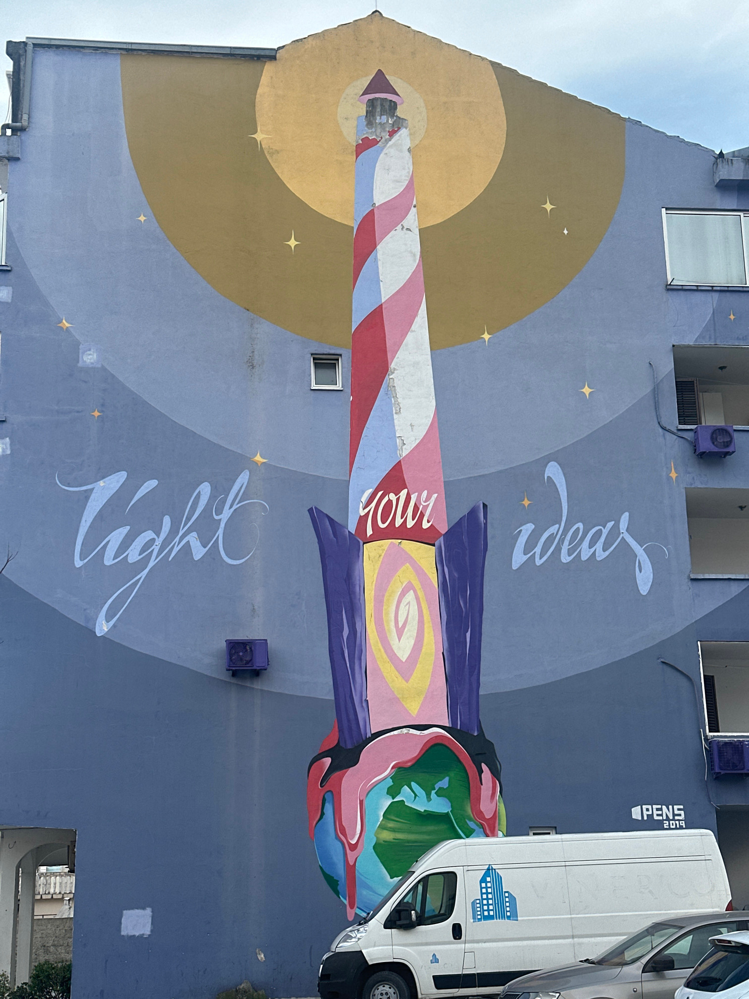 A large mural adorns the side of a building in Budva, Montenegro. The mural features a stylized lighthouse emitting golden light, with text reading "Light your ideas." A colorful, rocket-like structur…read more