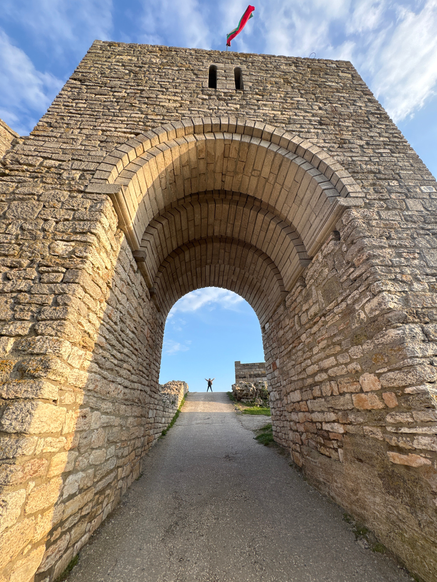 The image is a low-angle view through a stone archway. The arch is made of rough-hewn stones and constructed in a semi-circular form, leading to a pathway outside. The archway appears to be part of a…read more