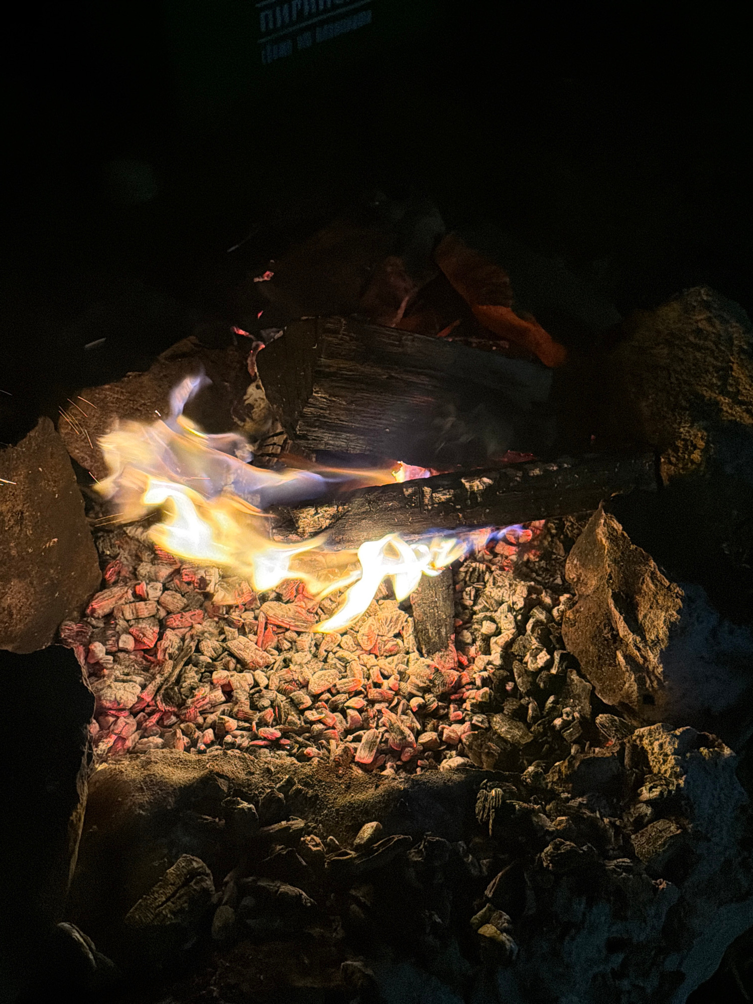 An outdoor fire is actively burning within a rock-lined fire pit, located in Tutrakantsi, Bulgaria. The scene is captured at night, illuminated primarily by the fire itself. Several dark, partially co…read more