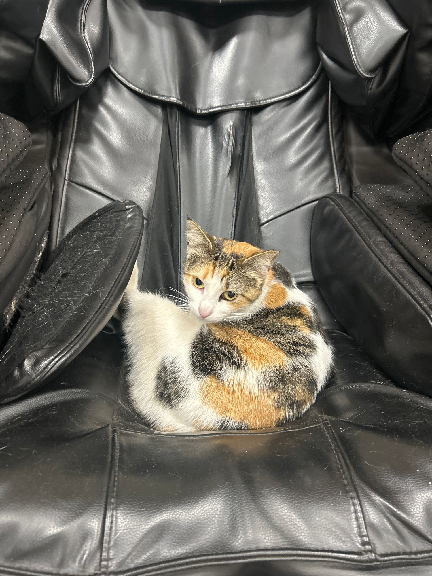 A medium-shot presents a calico cat curled in a black leather massage chair. The chair has perforated sections and shows signs of wear, including a tear in the leather. The cat is looking towards the…read more