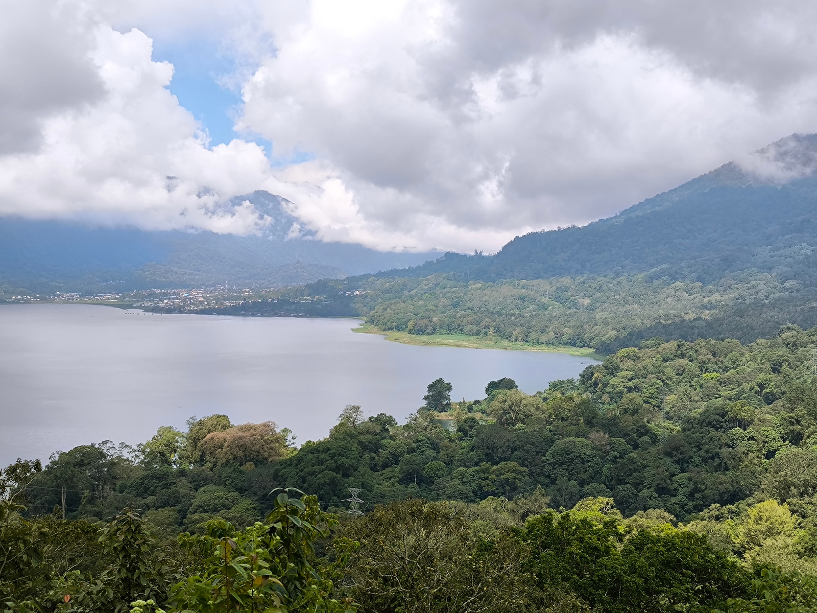 The image shows a landscape in Wanagiri, Indonesia. A lake fills the central portion of the frame, with forested hills surrounding it. The left side of the lake is bordered by a town. The sky is overc…read more