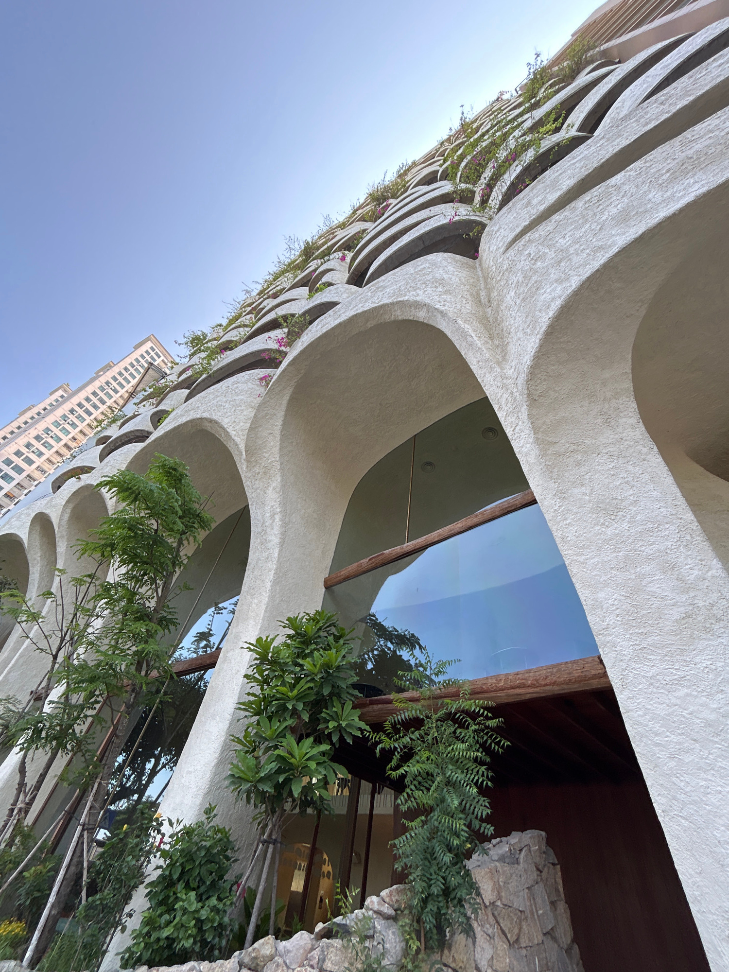 A low-angle shot captures the distinctive architectural features of a building in Bắc Nha Trang, Vietnam. The building's façade is characterized by curved, repetitive archways with rough white exterio…read more