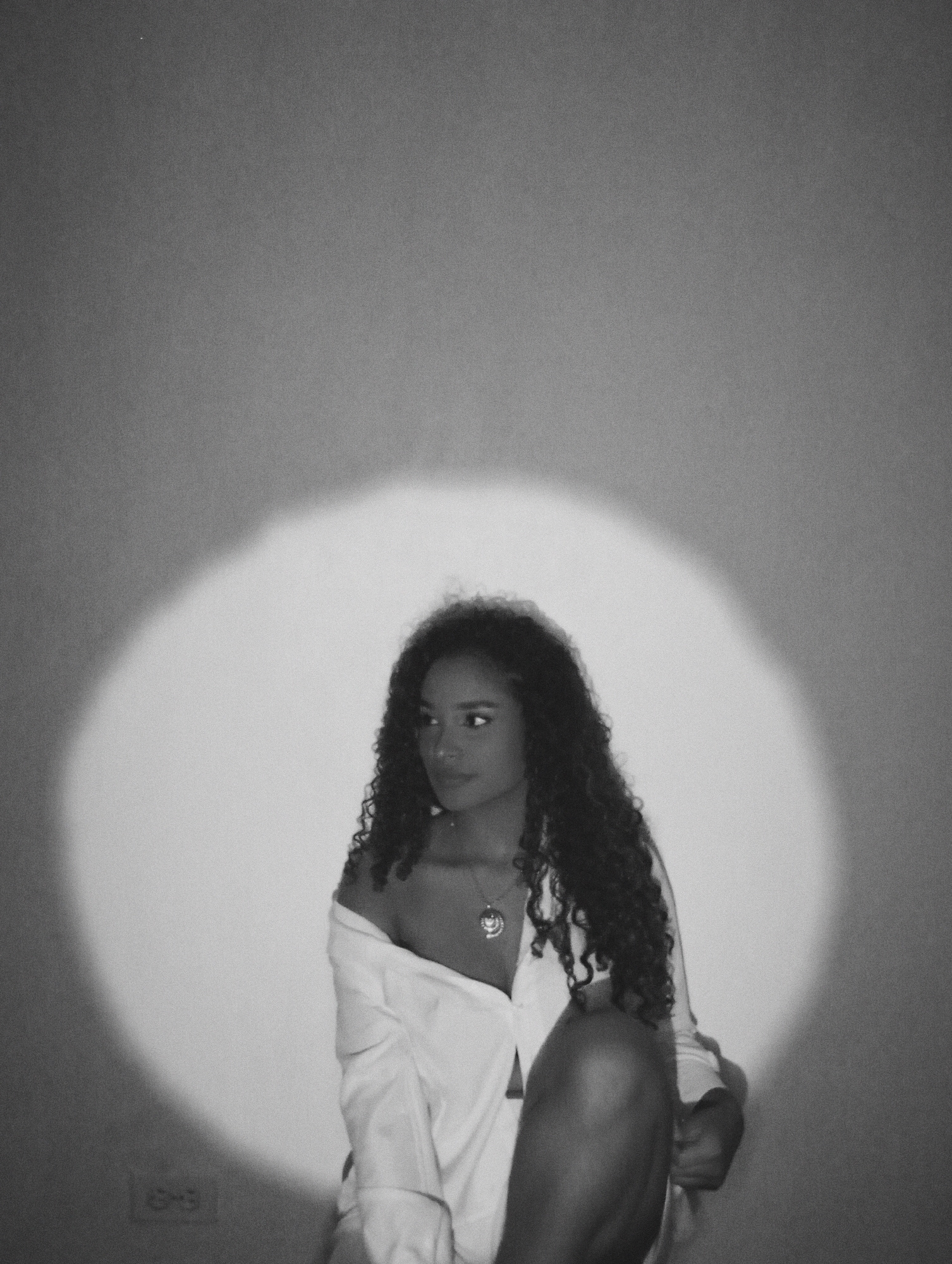 A black and white medium shot depicts a woman with long, curly hair, seated in front of a light-colored wall, with a large circular spot of light behind her. She is wearing a white, open-collared shir…read more