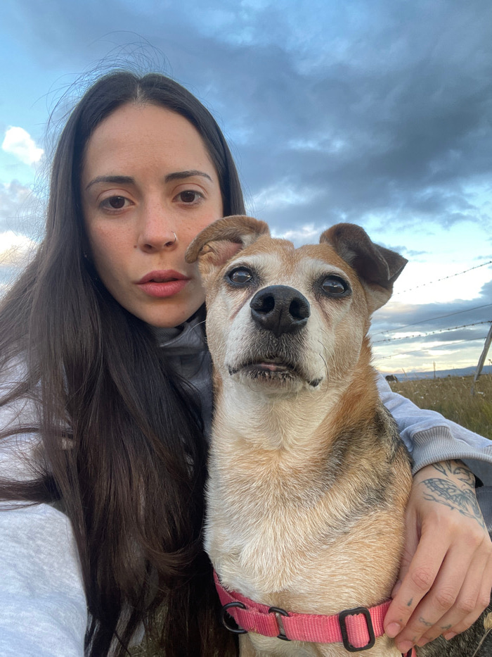 An outdoor portrait captured in Ushuaia, Argentina, depicts a female human subject and an adult dog. The female, positioned on the left side of the frame, has long, dark brown hair, brown eyes, and a…read more