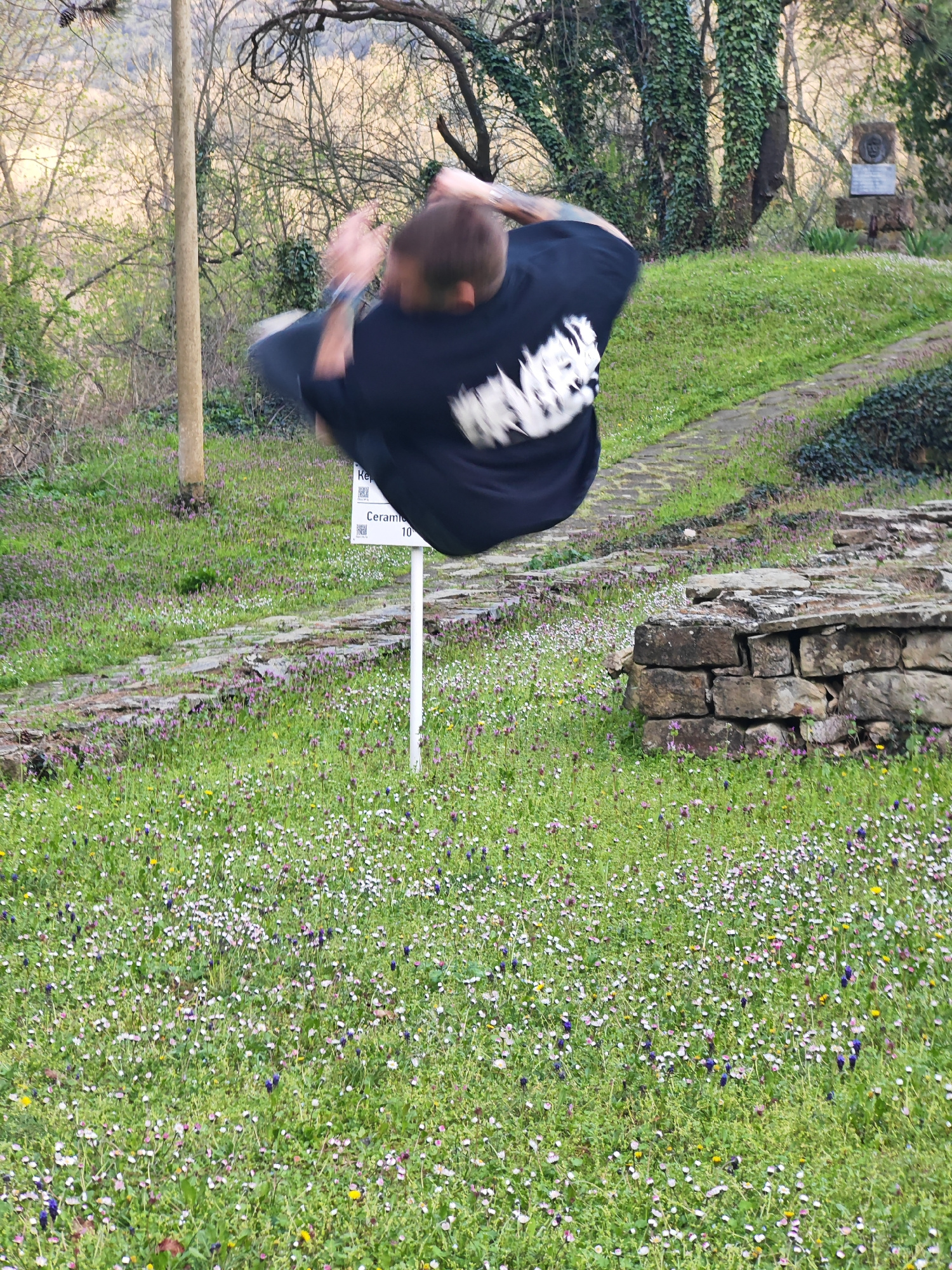 A man in a dark t-shirt with a white logo is performing a backflip in a grassy area. The location is Veliki Preslav, Bulgaria, as indicated by a sign in the background reading "Keramika 10." The area…read more