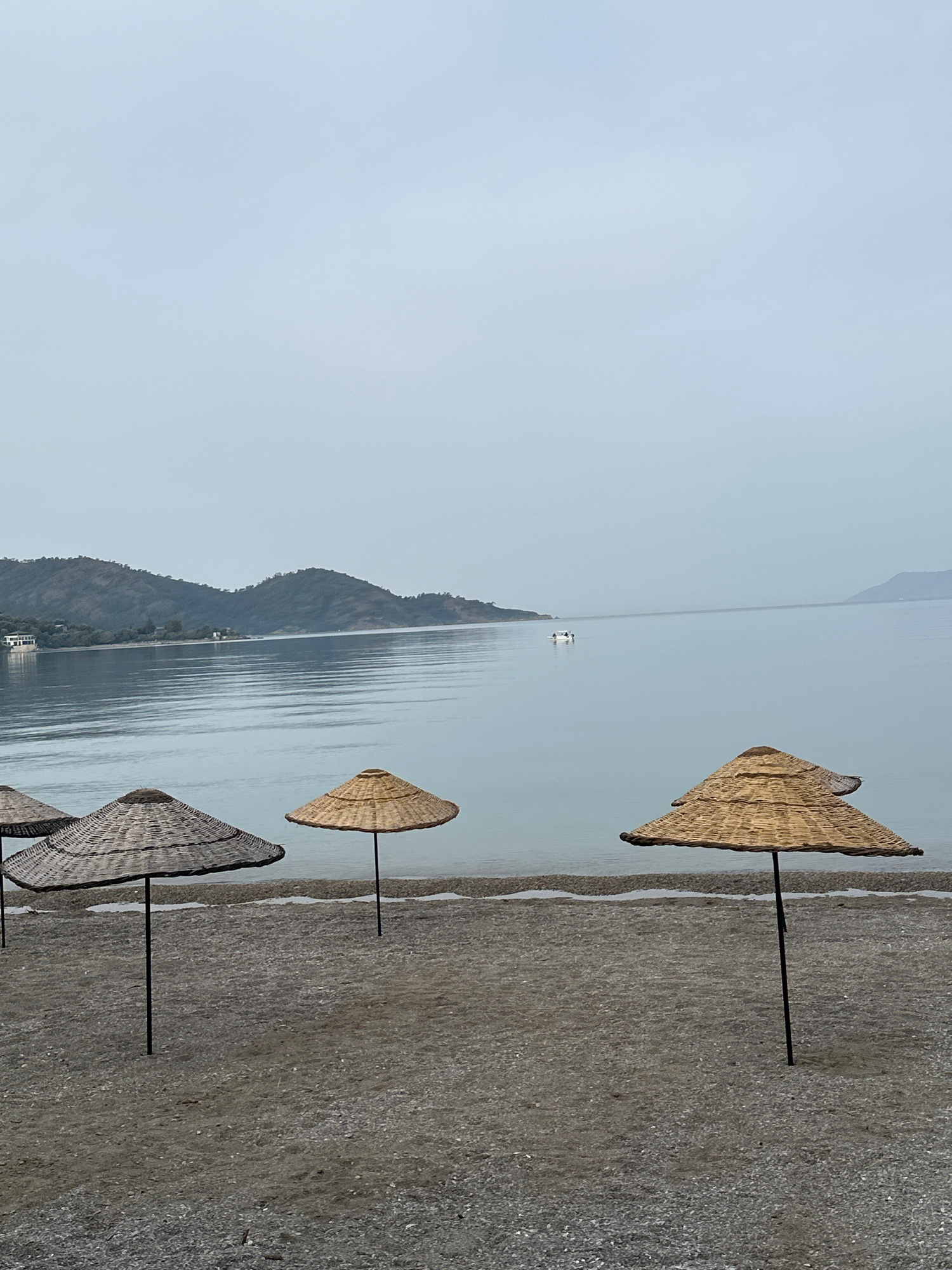 The image shows a beach scene in Fethiye, Turkey. Several straw umbrellas are planted in the sand near the water's edge. The water is calm, reflecting the sky. In the background, mountains rise along…read more