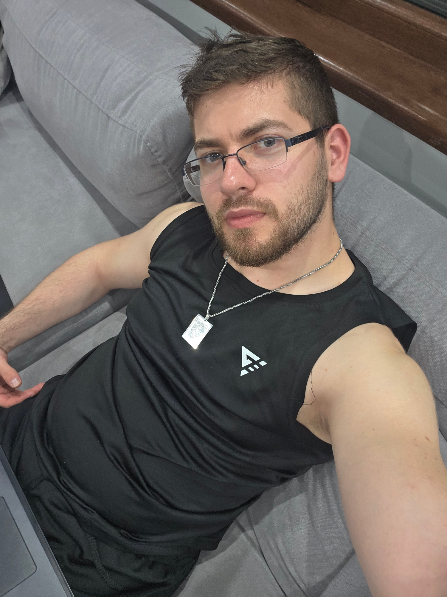 A man with short brown hair, a beard, and glasses is lying on a gray couch. He's wearing a black tank top with a white logo and a silver chain necklace. A laptop sits near his hip. The location appear…read more