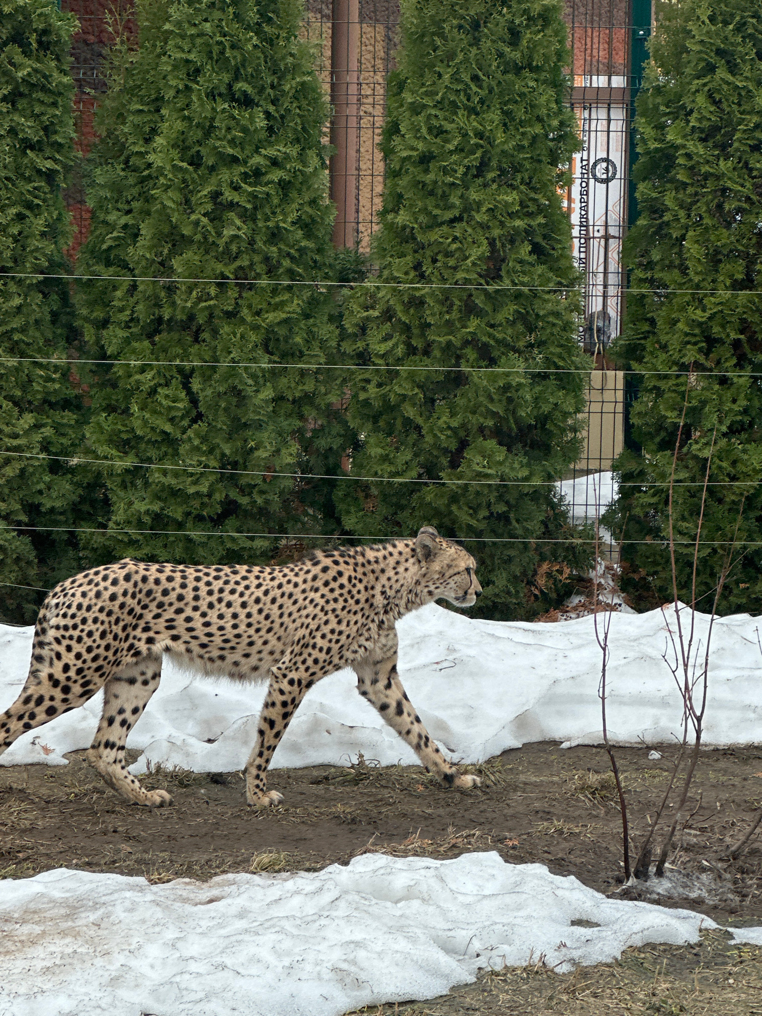 A cheetah stands on a patch of snow and dirt in an enclosure at the Kazan Zoo in Kazan, Russia. The cheetah is looking up and to the right. Behind the cheetah is a fence, trees and a building. The ima…read more