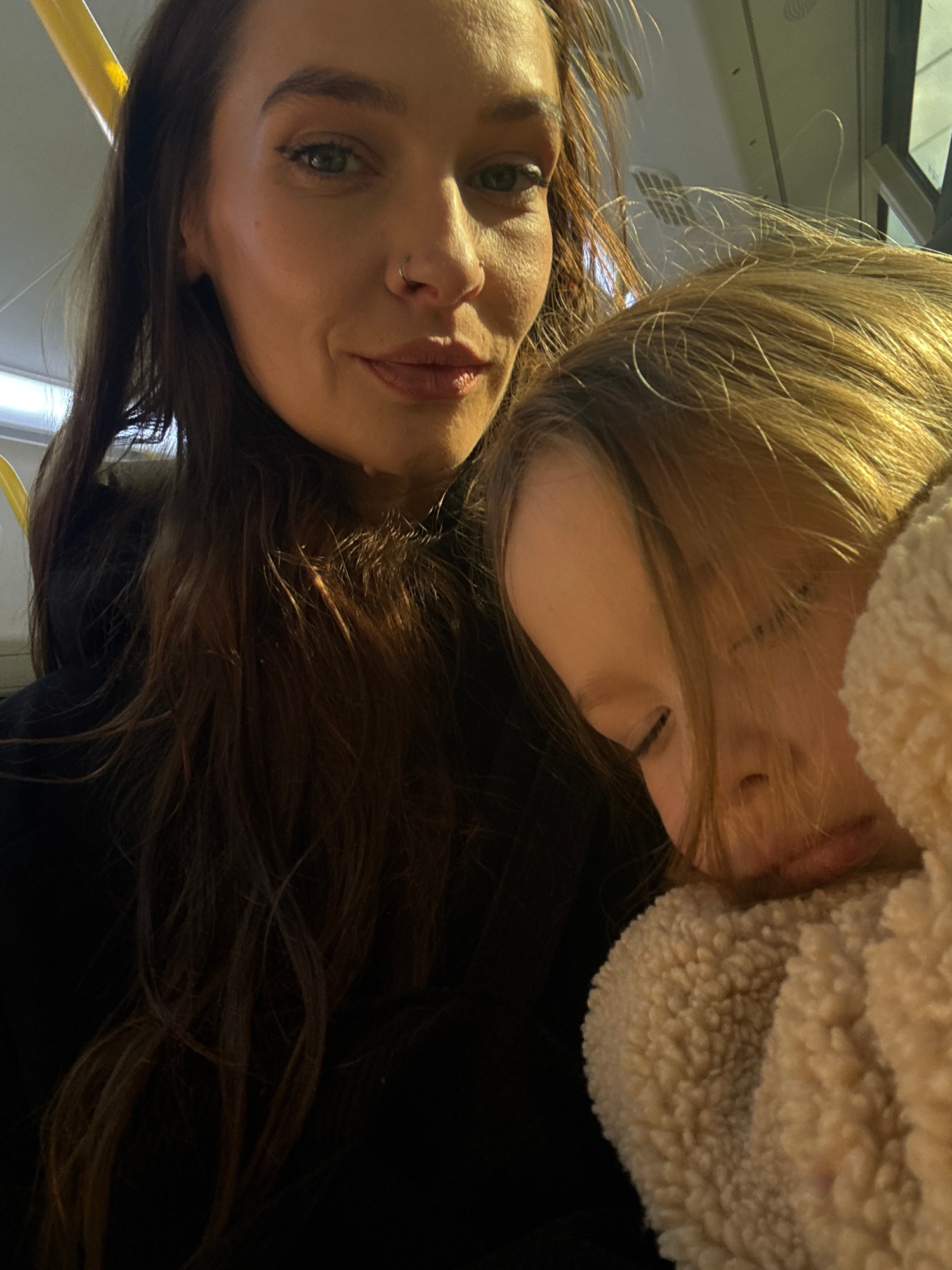 Two women are captured in a close-up photograph. The woman on the left has brown hair, fair skin, and a nose ring. Her green eyes are open, and she is looking at the camera with a slight smile. The wo…read more