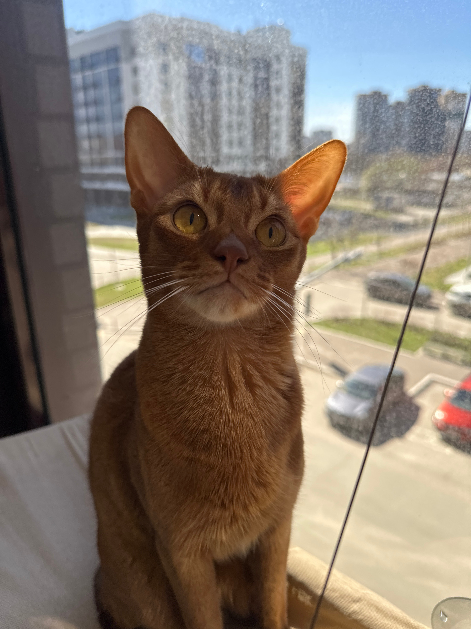 A close-up shot features an Abyssinian cat with reddish-brown fur, positioned against a cityscape visible through a window. The cat is angled, with its head and face prominently in the foreground, dis…read more
