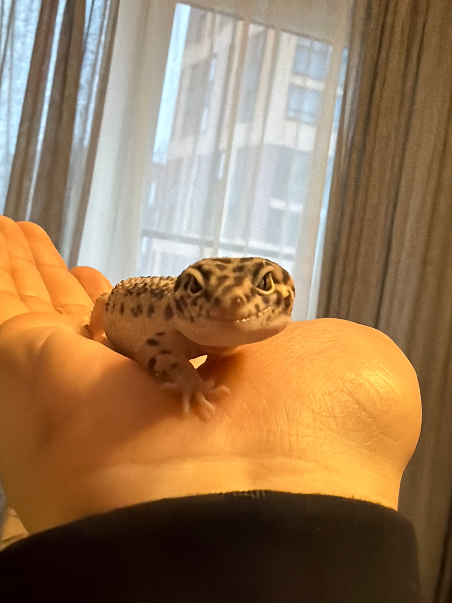 A person holds a leopard gecko in their hand. The gecko has a light tan base color with dark brown spots. The person's skin is light-toned, and they are wearing a black garment around their wrist or a…read more