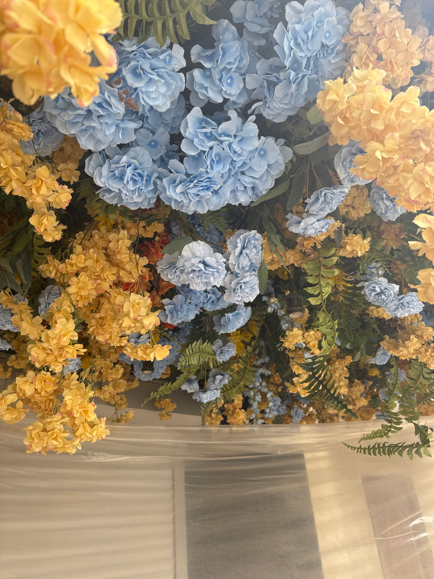 The image captures a vibrant decorative wall or backdrop filled with artificial flowers and foliage. The display is predominantly composed of clusters of soft pastel blue flowers, resembling hydrangea…read more