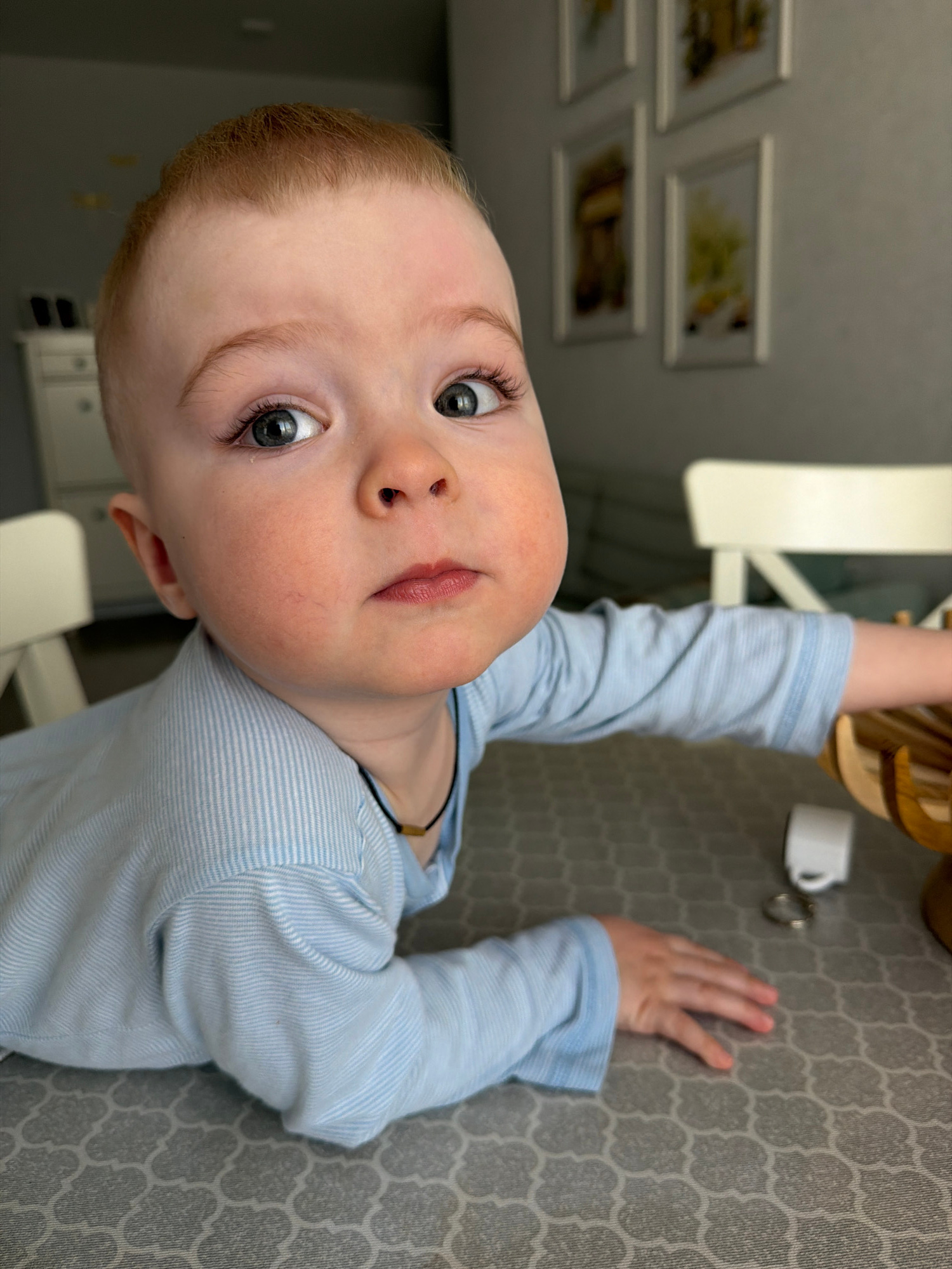 This close-up image, captured in Votkinsk, Russia, features a young child, likely a toddler, looking directly at the camera with a curious and engaging expression. The child has light reddish-blonde h…read more