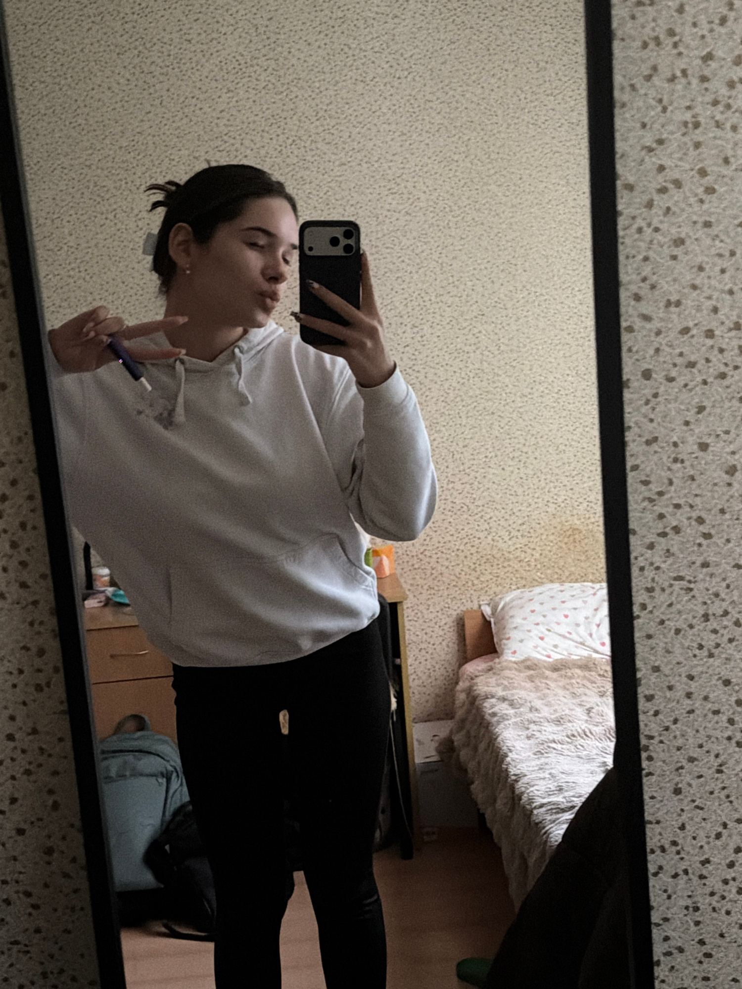 The image displays a young woman taking a mirror selfie indoors. She is reflected in a large mirror with a black frame, capturing her full body and parts of the surrounding room. The woman is wearing…read more