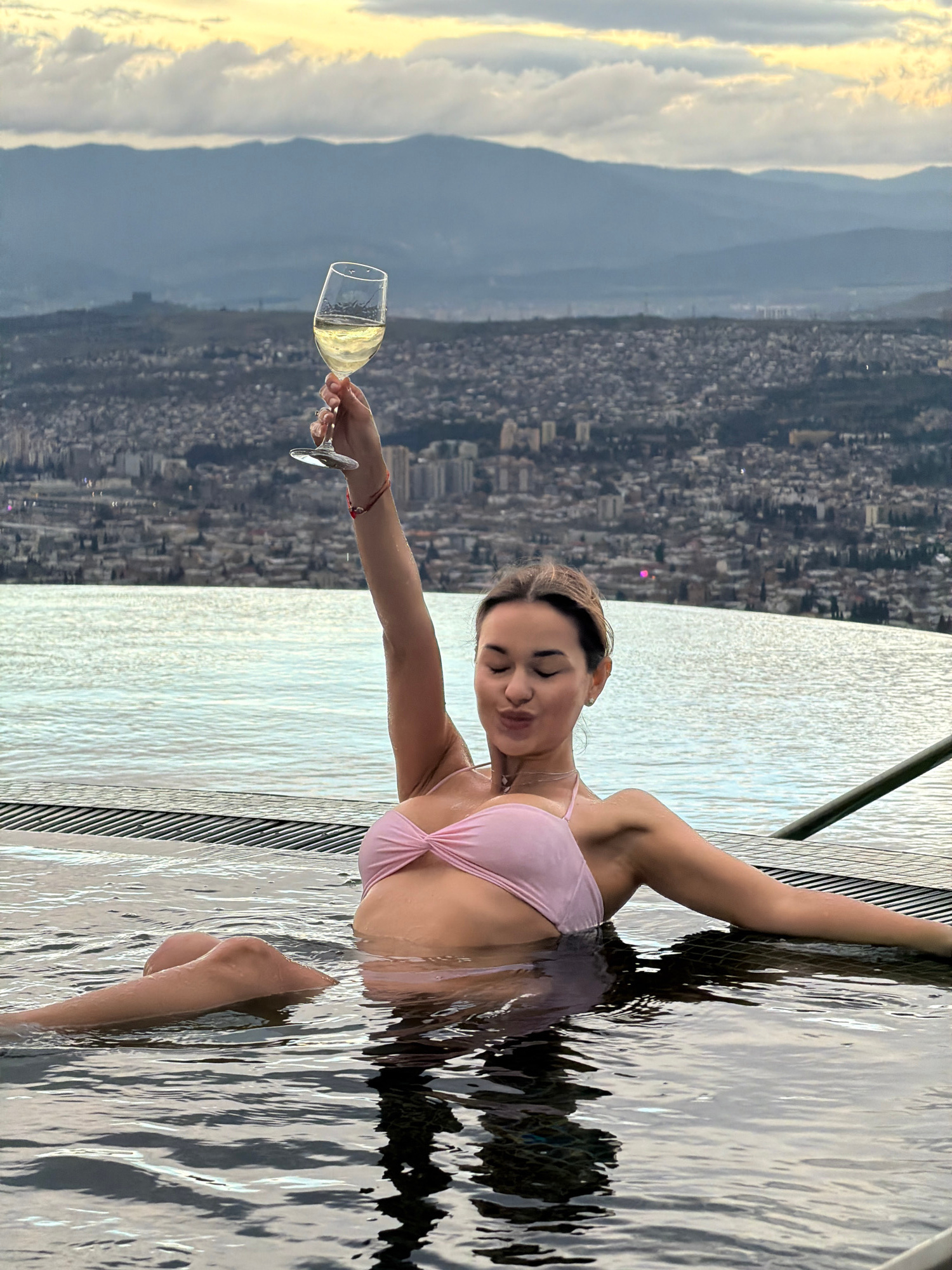 An elevated, high-angle view depicts a woman partially submerged in an infinity pool, overlooking the city of Tbilisi, Georgia, with a distant mountain range under a cloudy sky. The subject is a fair…read more