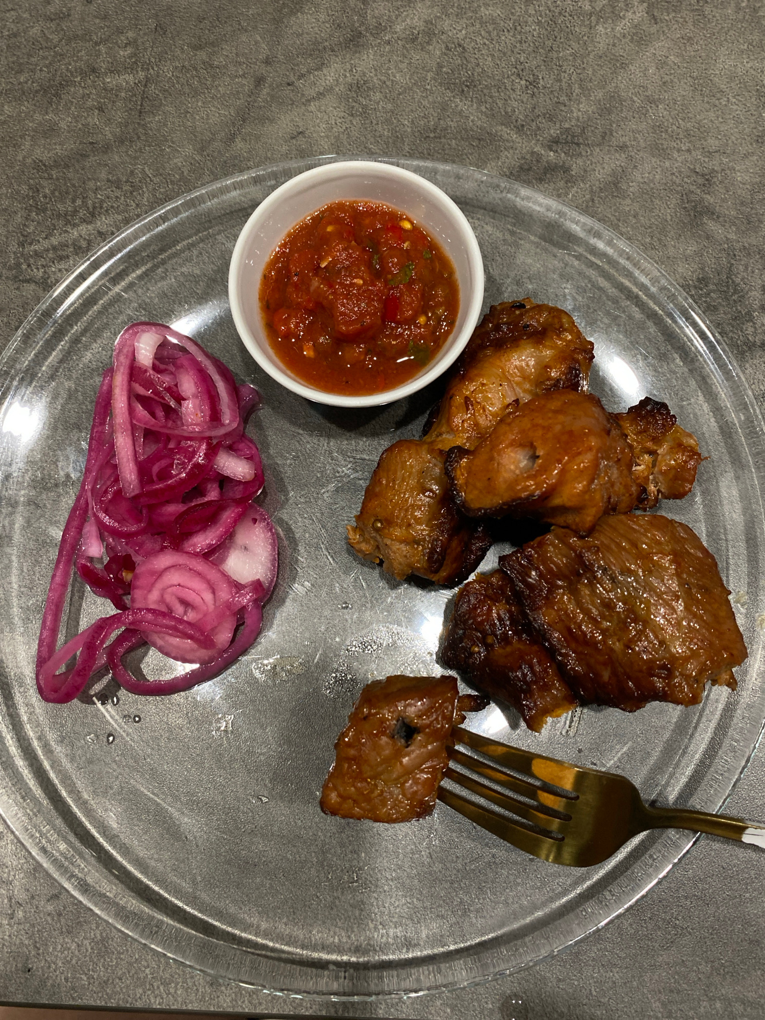 The image shows a plate of food, likely a meal, on a grey, textured surface. The plate appears to be made of clear glass or plastic. Food items include several pieces of cooked meat, possibly shashlik…read more