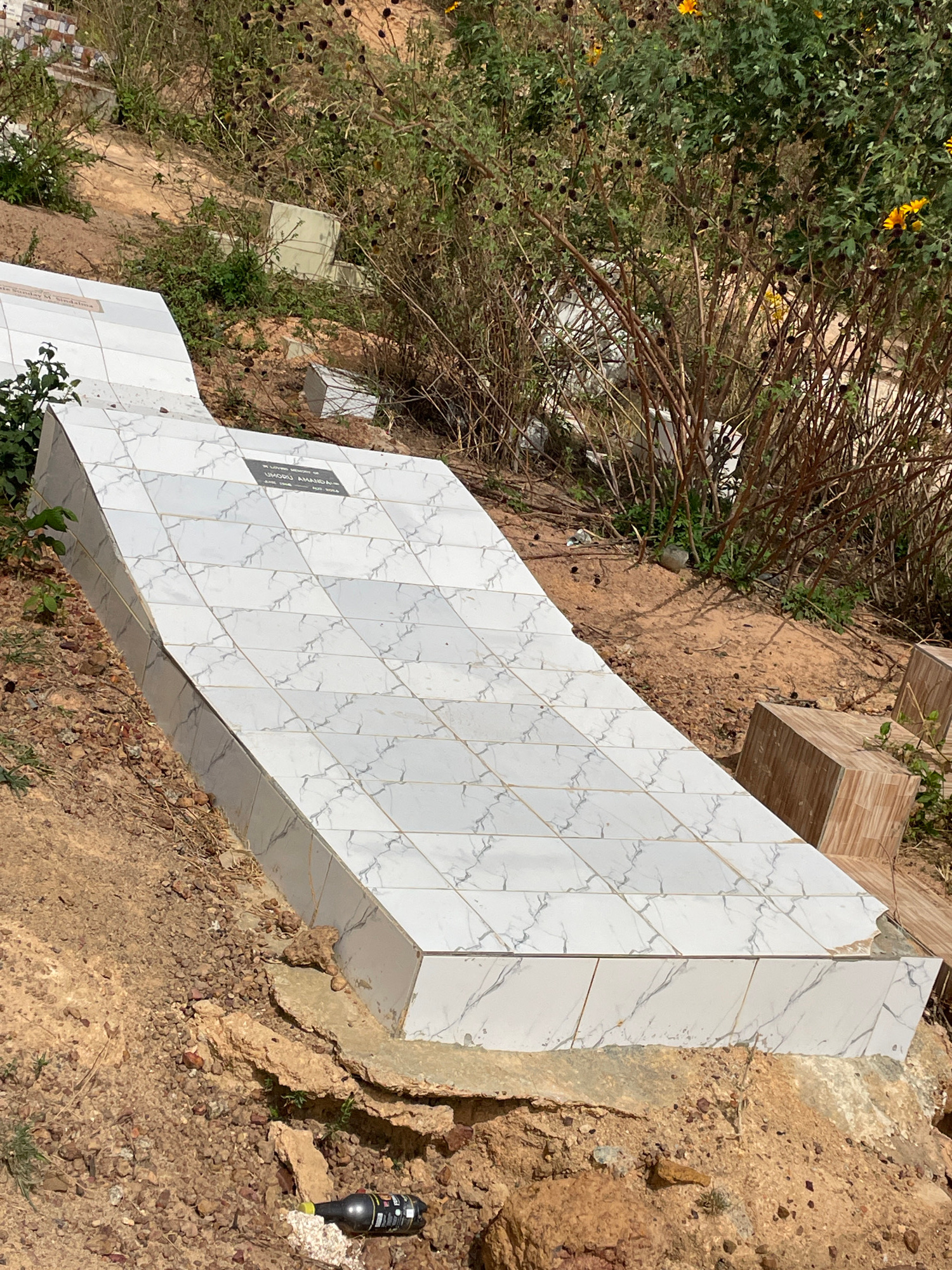 The image depicts a cemetery in Bar Jirgi Summa, Nigeria. A large, white marble-tiled tombstone dominates the scene. The tombstone appears newly constructed and features a small, dark plaque near its…read more