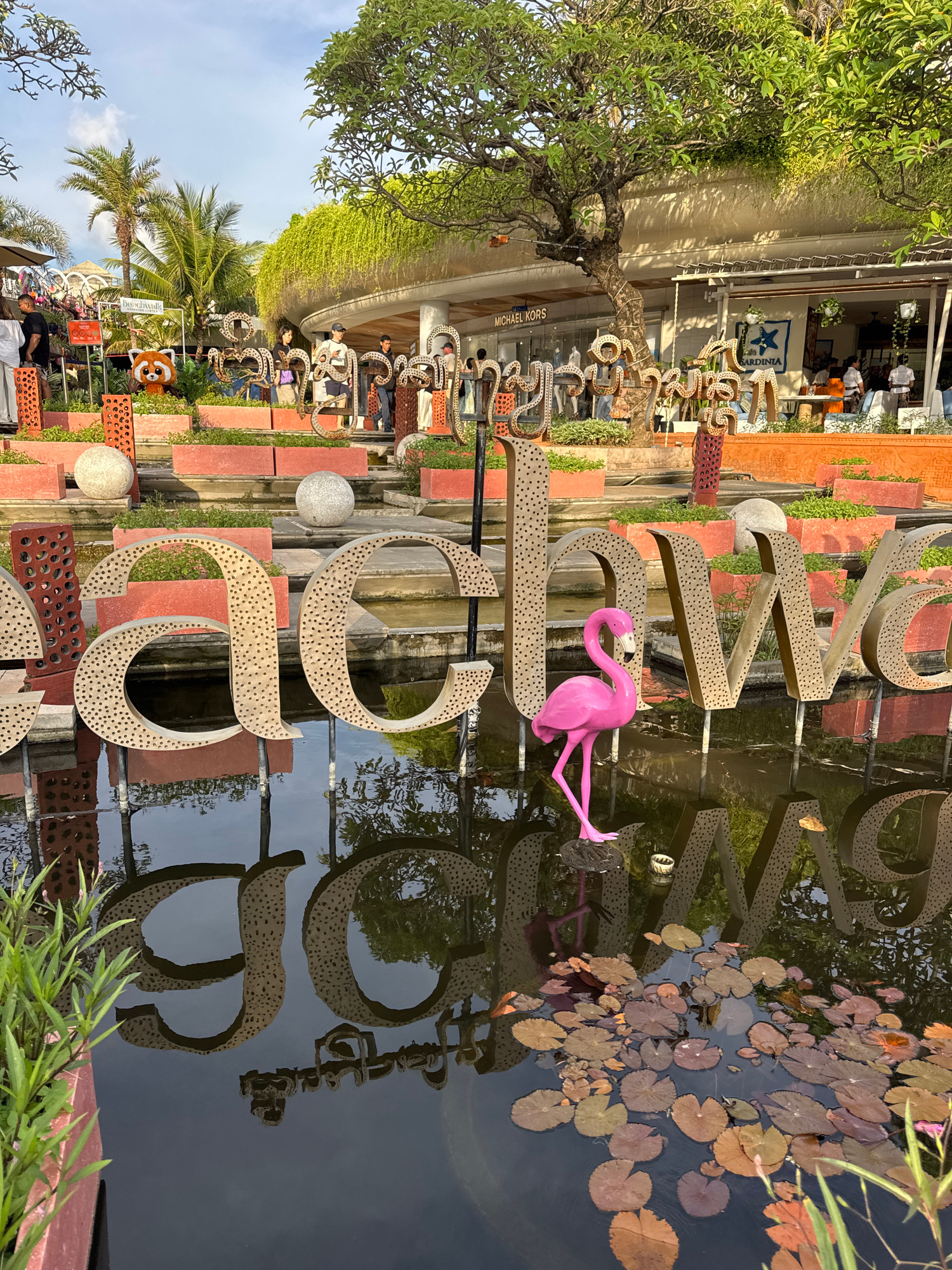 This image shows a decorative installation spelling out the word "LOVE" in Kuta, Indonesia. The letters are made of a perforated, light brown material and are positioned partially submerged in a pond…read more